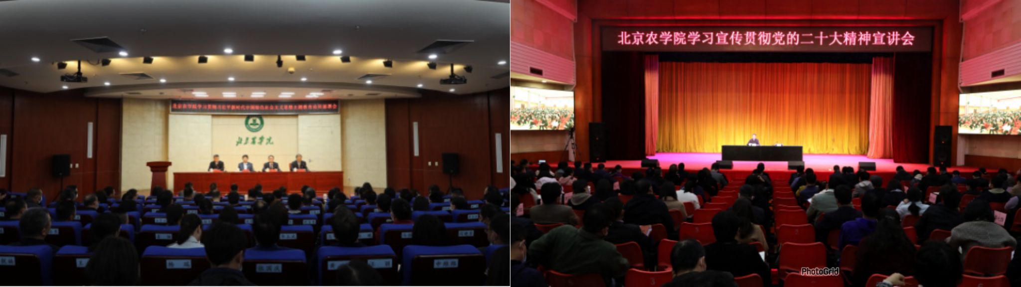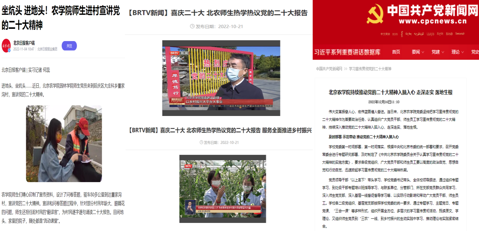 黨的二十大召開后,學(xué)校迅速掀起學(xué)習(xí)宣傳貫徹?zé)岢保M織宣講團成員深入師生、“三農(nóng)”一線開展宣講,《推動二十大精神在師生服務(wù)鄉(xiāng)村振興的實踐中開花結(jié)果》榮獲北京教育系統(tǒng)“創(chuàng)新案例”,新華社、中央電視臺、人民日報、光明日報、中國教育報、北京日報、北京電視臺等對我校師生學(xué)習(xí)貫徹黨的十九大精神、二十大精神,服務(wù)鄉(xiāng)村振興典型事跡進行深入報道。