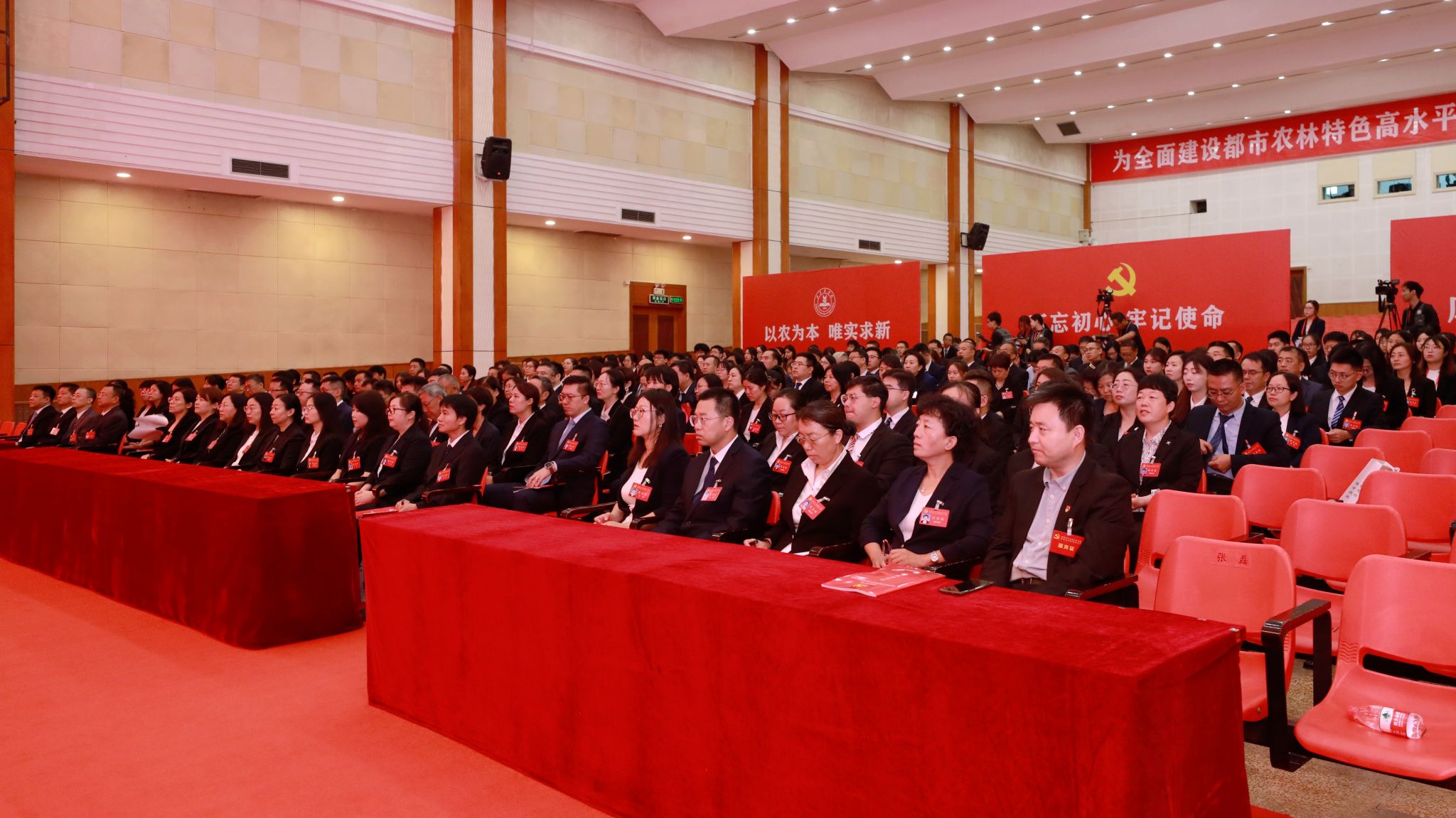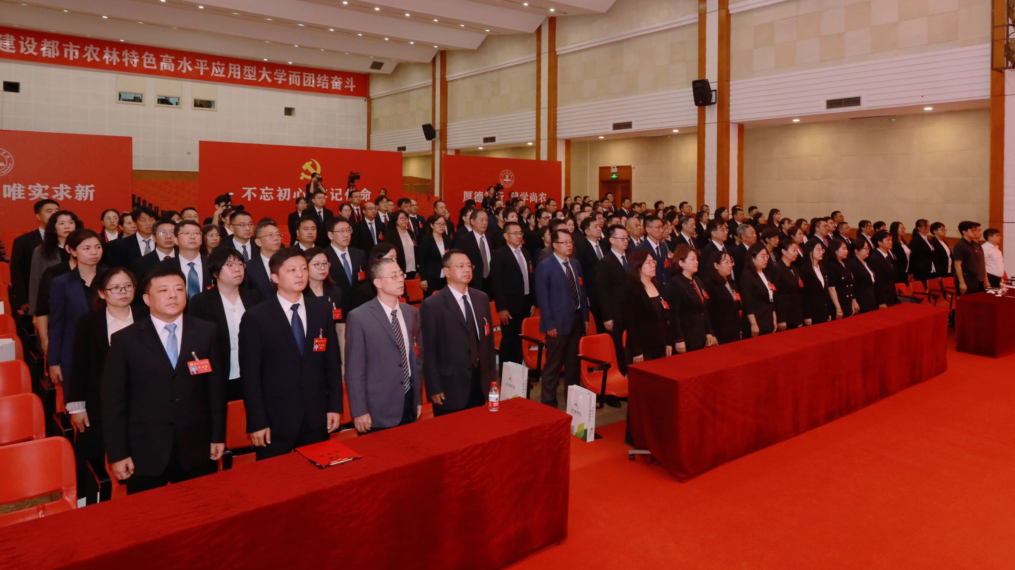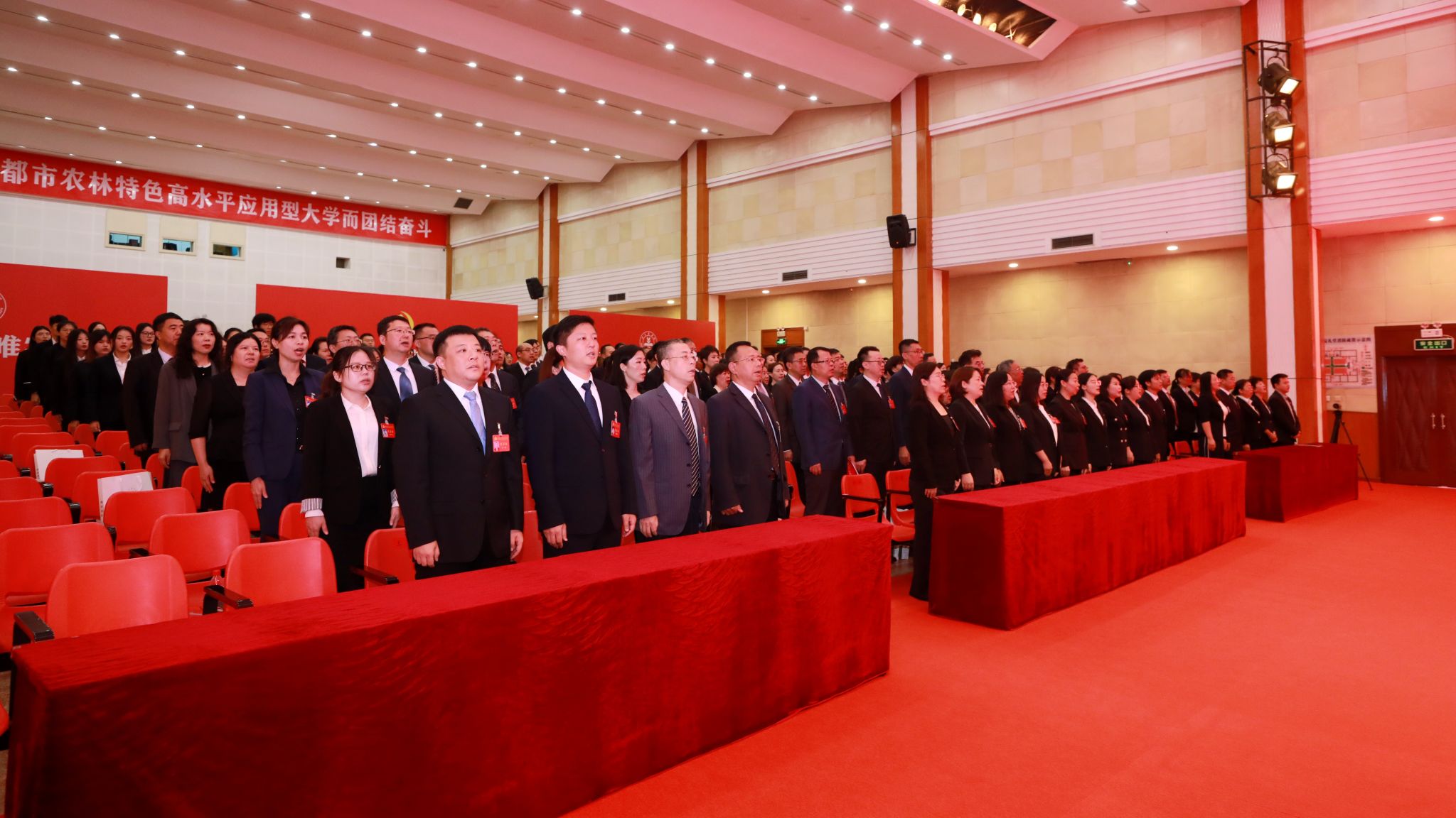 大會會場內氣氛莊重熱烈,主席臺正中是由鐮刀和錘頭組成的中國共產黨黨徽,十面紅旗分列兩側。大會會場后方,寫有“為全面建設都市農林特色高水平應用型大學而團結奮斗”的橫幅格外醒目。