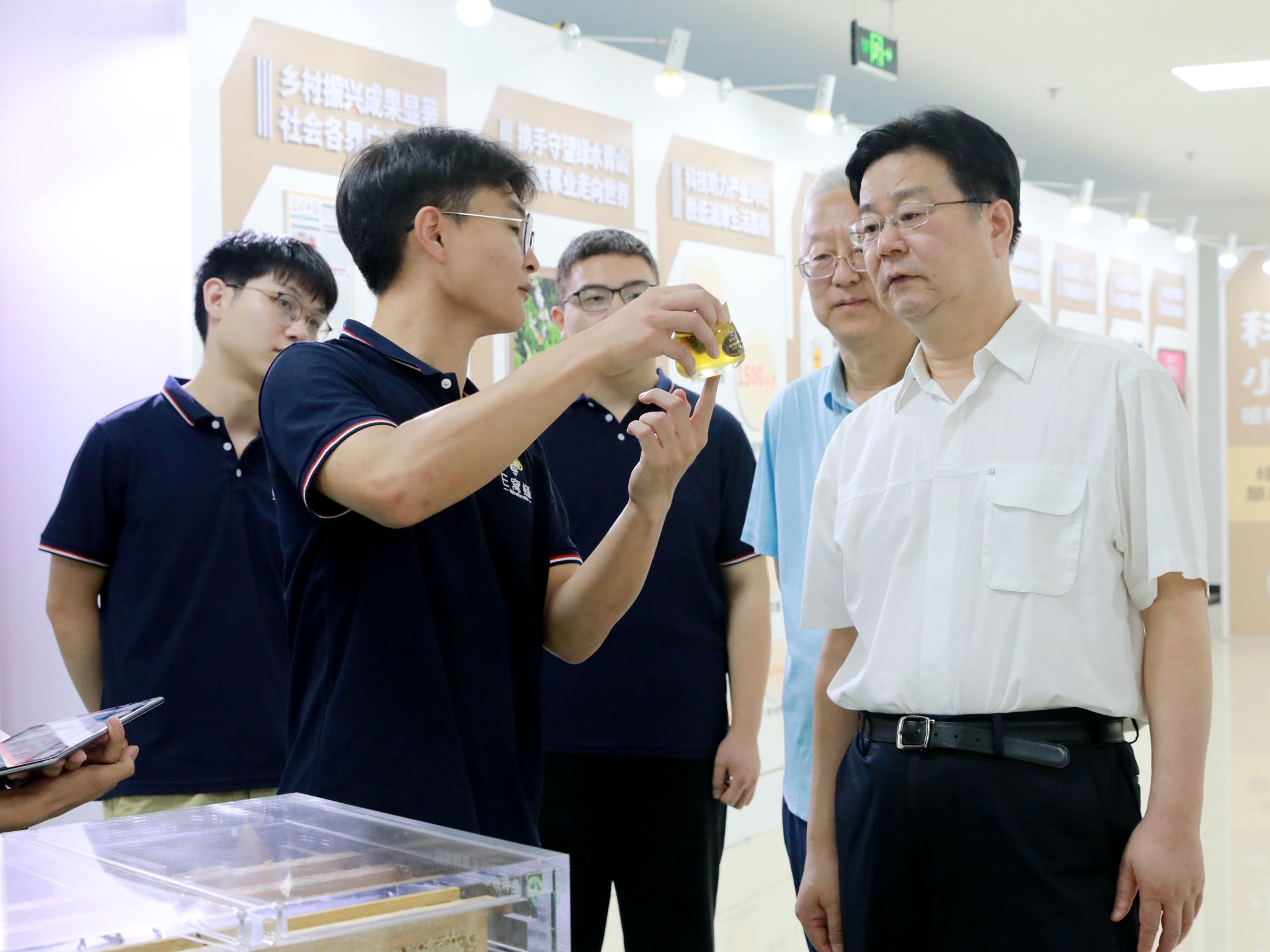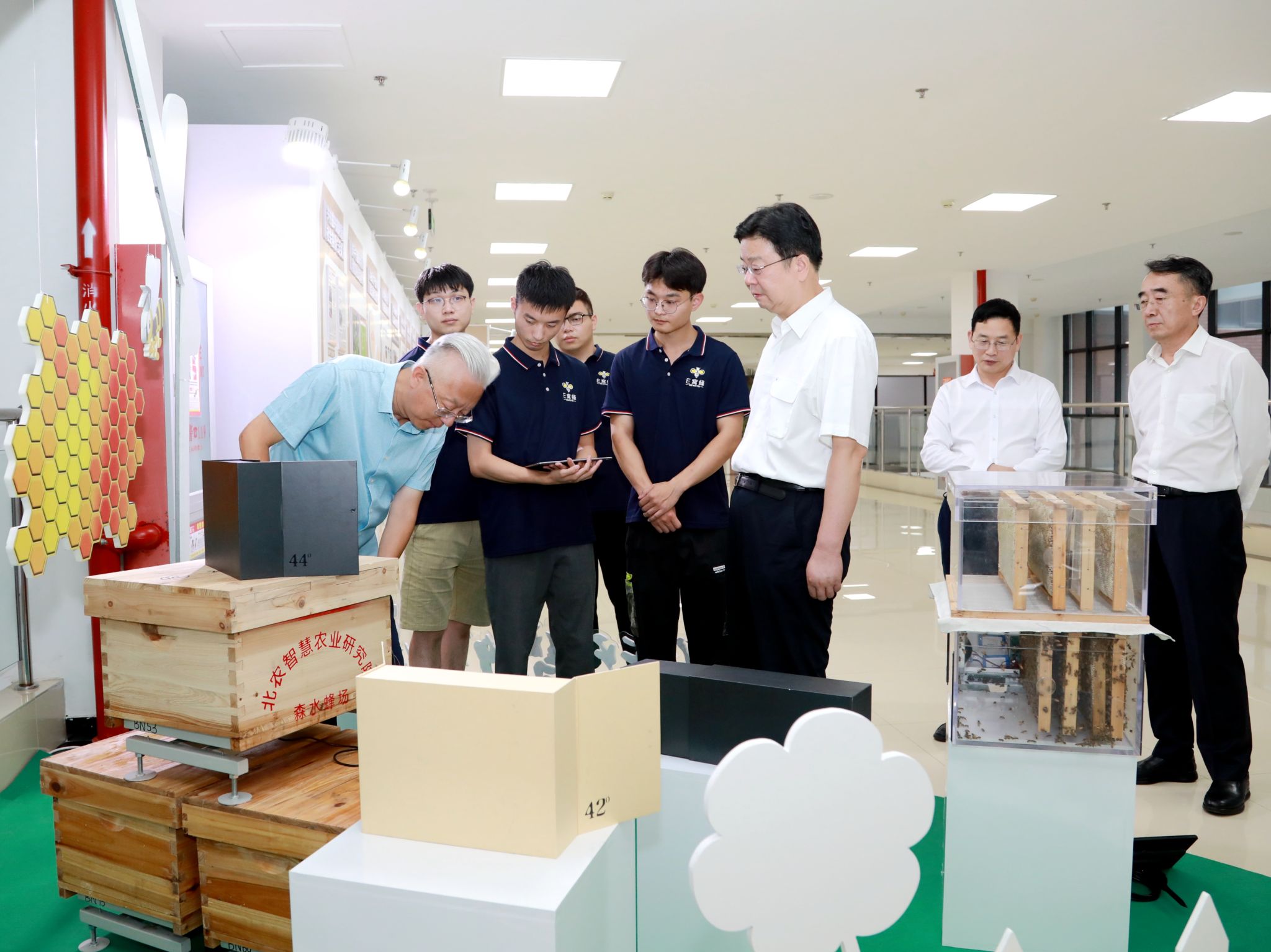 在北京農學院科技小院“北農智慧蜂場”展區,游鈞聽取了科技小院發揮專業優勢、扎根房山蒲洼,建設智慧蜂場、用科技助力鄉村振興的做法。該科技小院的5名同學暑期開展服務鄉村振興社會實踐時因暴雨被困蒲洼科技小院,在市委教育工委、地方政府和學校多方努力下,第一時間安全返回校園。游鈞親切詢問同學們現在的學習、生活情況,得知他們已經重返科技小院,幫助蜂農采收蜂蜜,助力農民增收致富,游鈞給予充分肯定,并鼓勵他們繼續扎根基層一線,為鄉村振興貢獻青春力量。