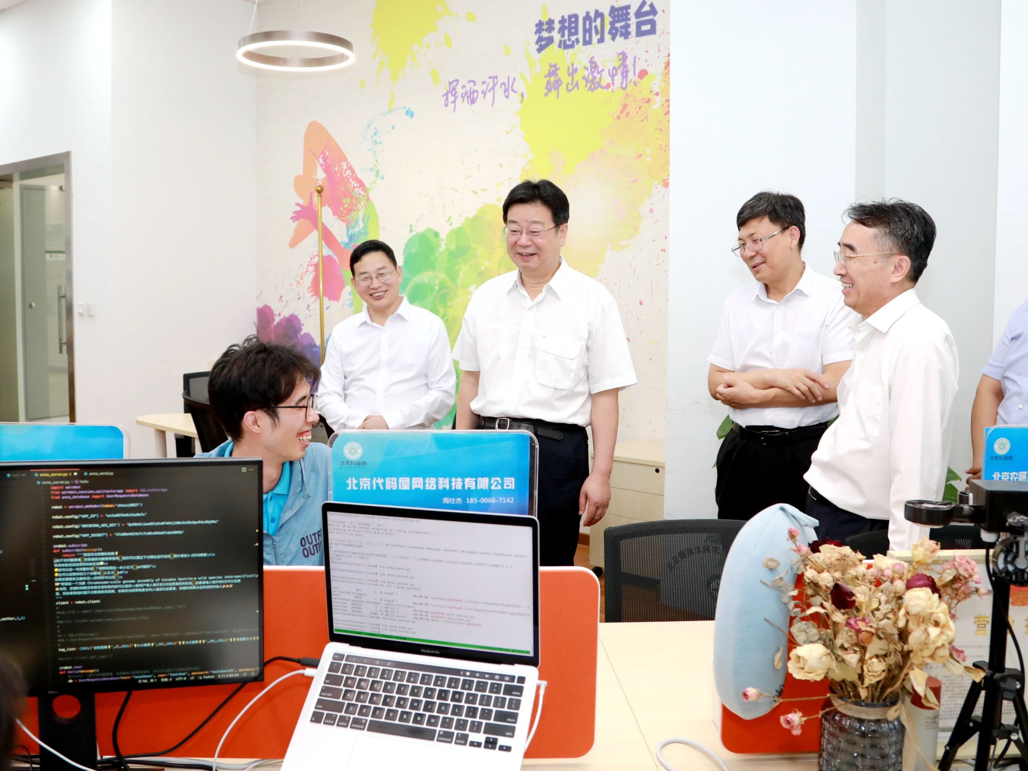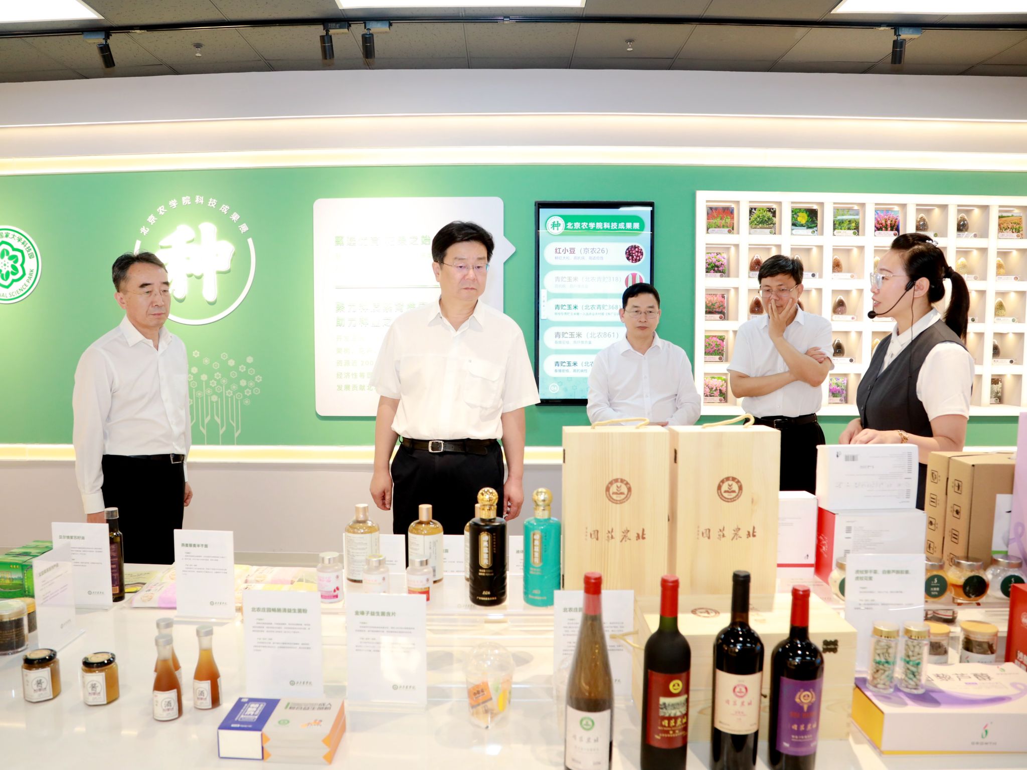 游鈞來到北京農學院國家大學科技園,參觀了大學生眾創空間、直播實訓基地,與正在開展創新創業活動的北京農學院畢業生代表親切交流,了解創業項目運營及收益情況。在大學科技園科技成果轉化展廳,游鈞一邊聽取工作人員講解,一邊駐足觀看學校師生在“種、花、果、實”等方面的科技成果轉化產品,細致了解了學校近年來的科技成果轉化情況和社會服務成效。
