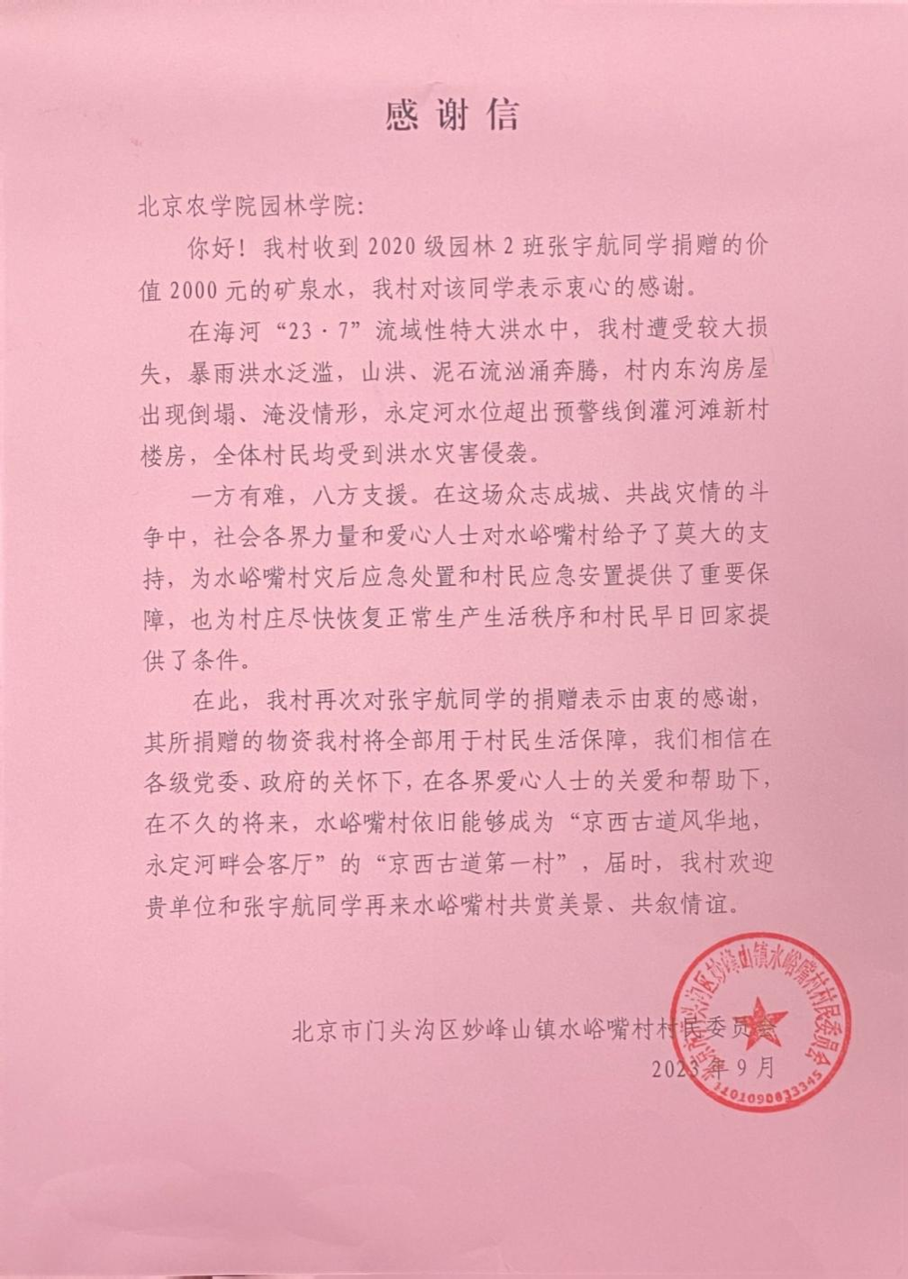 水峪嘴村村民委員會對張宇航同學表示由衷的感謝,感謝信中寫道:“洪災發生后,您第一時間伸出援助之手,為妙峰山鎮抗洪搶險和恢復重建提供了有力的支持和保障,堅定了我們重建家園的信心和決心。”村委會表示,在各界愛心人士的關愛和幫助下,不久的將來水峪嘴村一定會再次煥發“京西古道第一村”的風采,“屆時歡迎張宇航到水峪嘴村共賞美景、共敘情誼。”