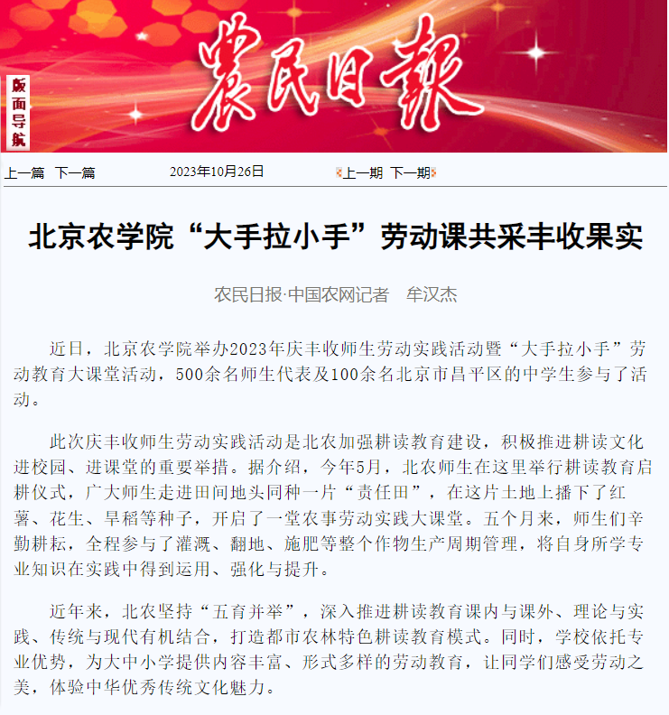 近日,北京農學院舉辦2023年慶豐收師生勞動實踐活動暨“大手拉小手”勞動教育大課堂活動,500余名師生代表及100余名北京市昌平區的中學生參與了活動。