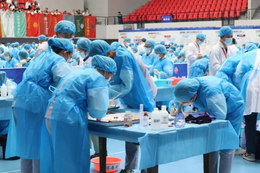 本屆比賽分為山羊瘤胃切開術、病原菌檢查與血凝試驗、禽的病理剖檢三個部分。成績評定標準以參賽隊伍現場操作的規范性、熟練程度和配合情況等進行綜合考量,82名裁判打分按比例折算團隊得分。我校代表隊成員柏良庸、劉瑩、王方、梁雪菲、馬子禾在指導老師張建軍、張華、周雙海、張永紅的示范和指導下,熟練、高質量地完成系列操作,充分展示了動醫專業學生扎實的實操技能和較高的專業素養。