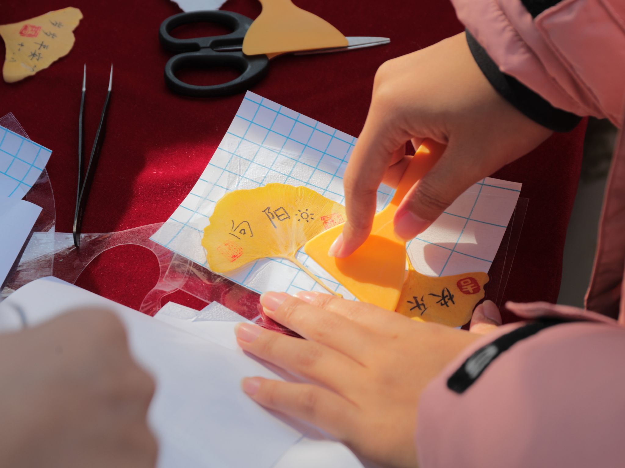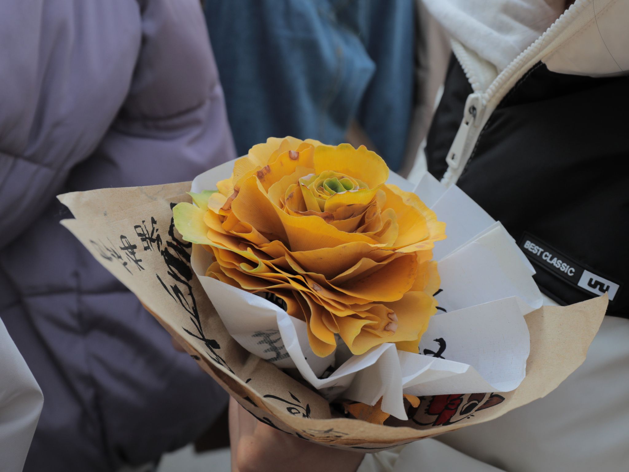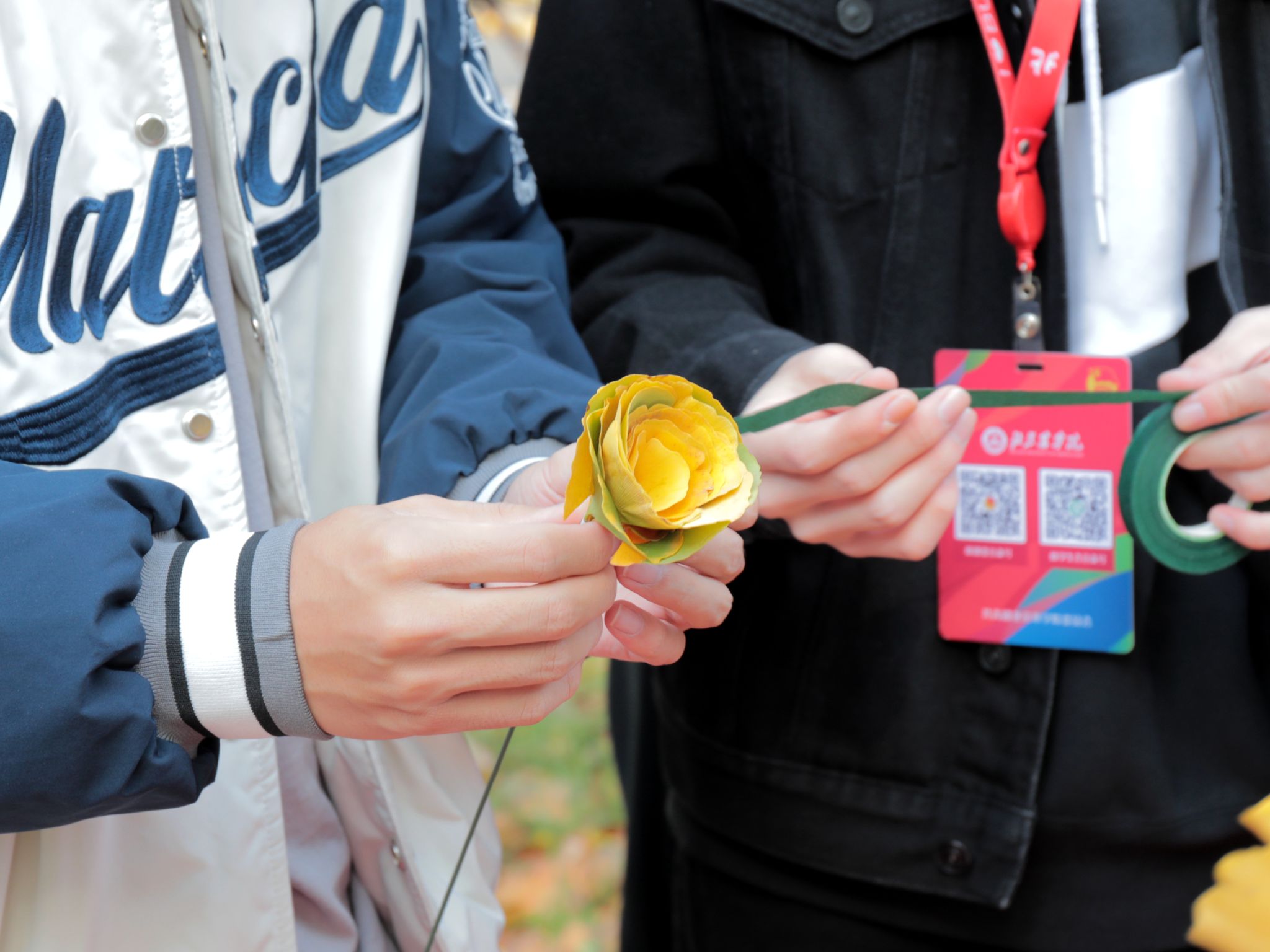將落葉“變”成花,讓燦爛的銀杏葉又多了一份浪漫。同學們在專業人員的指導下紛紛學習如何制作銀杏花束。“遍地的落葉從前只是拍照的背景,沒有想過還可以變成絢爛的花束,”韓瑀譞同學驚嘆于這個創意的巧妙,“這個活動啟發我創意無止境,更讓我體會到人與自然的和諧共生的美好。”