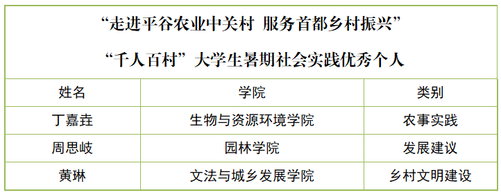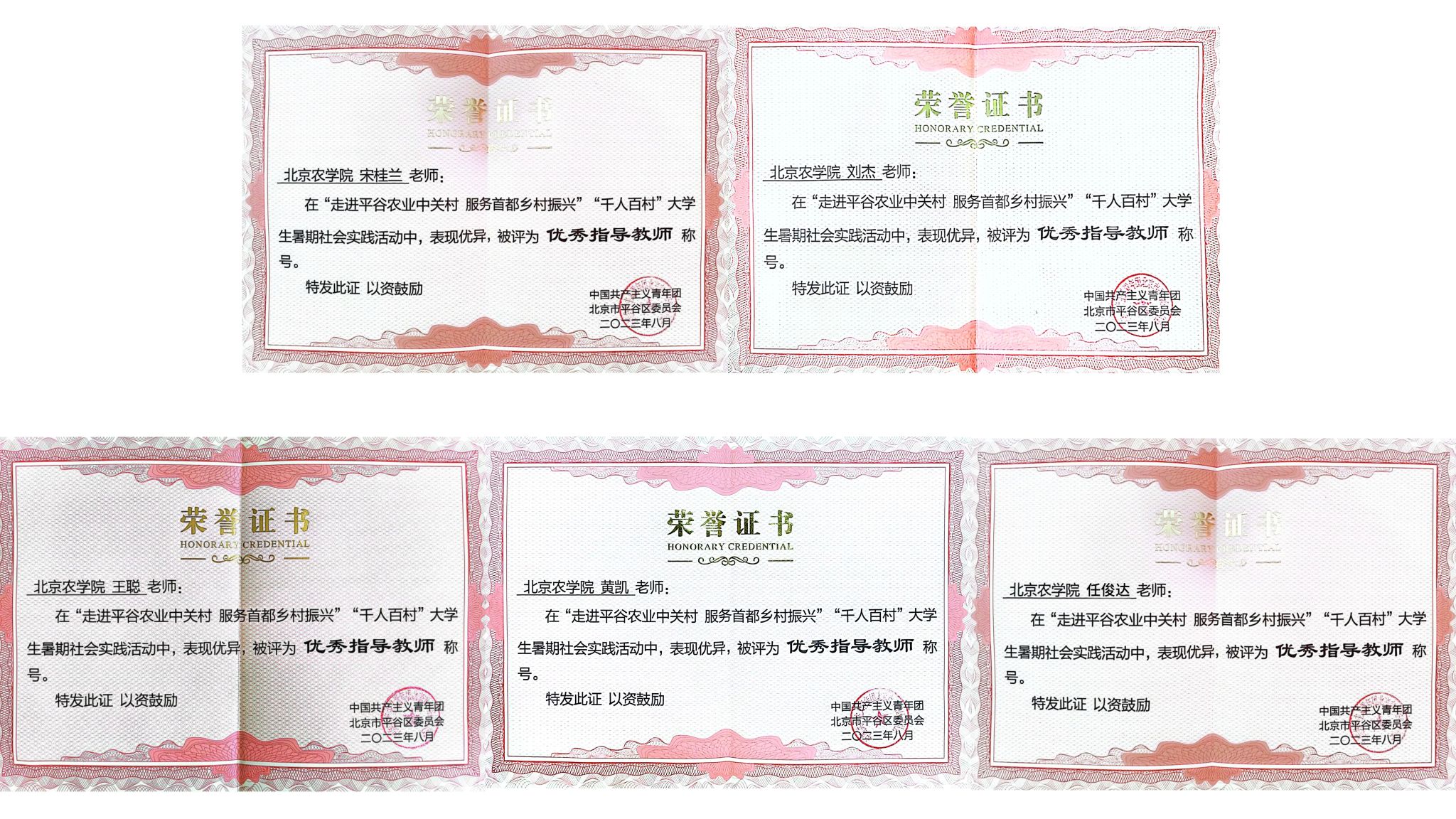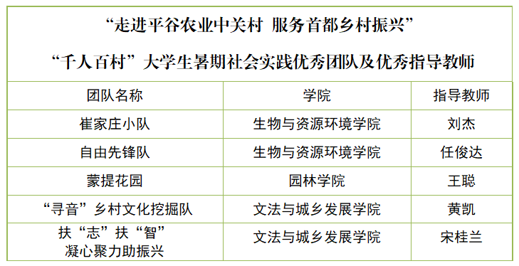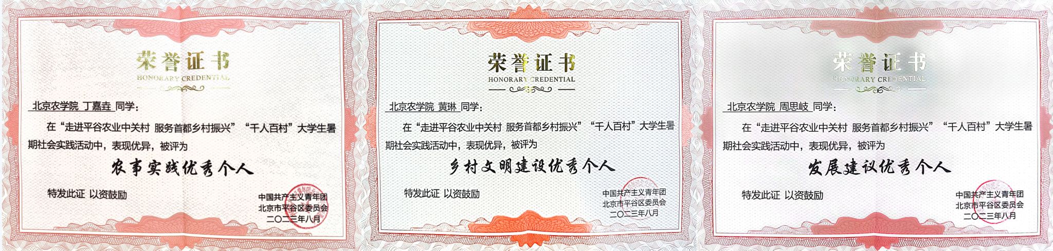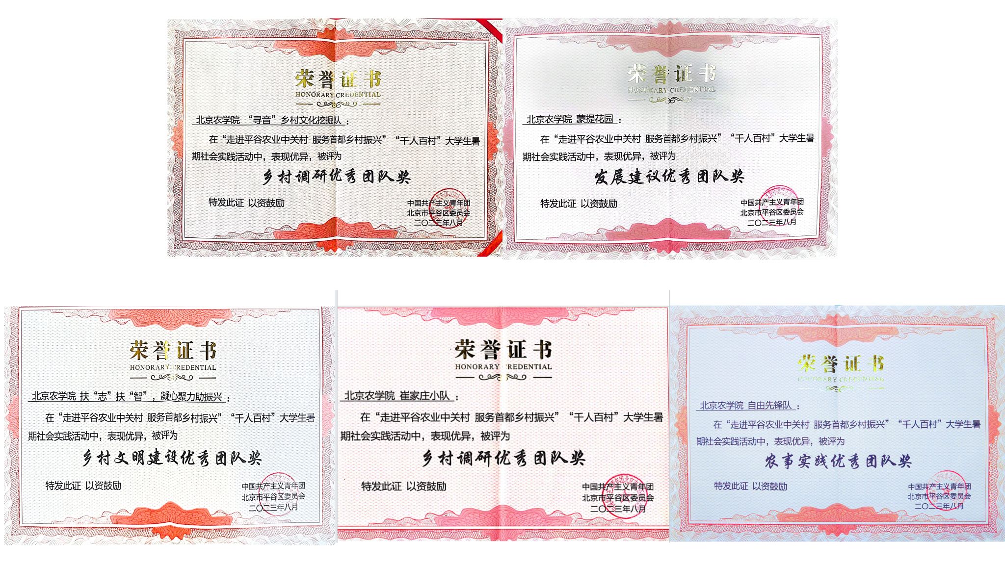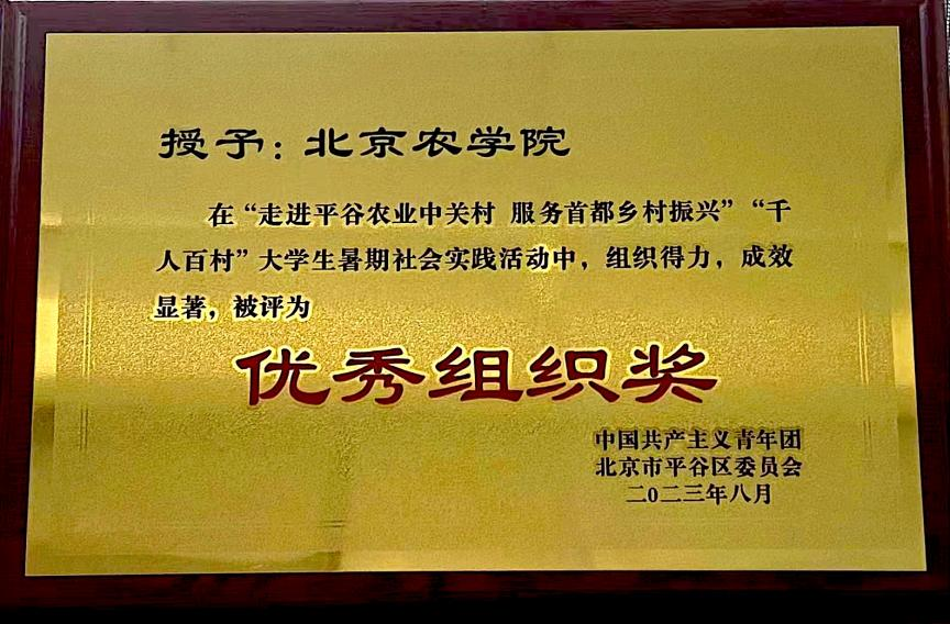近日,2023年“走進(jìn)平谷農(nóng)業(yè)中關(guān)村 服務(wù)首都鄉(xiāng)村振興”首都高校“千人百村”大學(xué)生暑期社會(huì)實(shí)踐評(píng)獎(jiǎng)結(jié)果公布。北京農(nóng)學(xué)院榮獲“優(yōu)秀組織獎(jiǎng)”;崔家莊小隊(duì)、自由先鋒隊(duì)、“尋音”鄉(xiāng)村文化挖掘隊(duì)、“蒙提花園”隊(duì)、“扶‘志’扶‘智’,凝心聚力助振興”隊(duì)榮獲“優(yōu)秀團(tuán)隊(duì)獎(jiǎng)”;五個(gè)優(yōu)秀團(tuán)隊(duì)的指導(dǎo)教師劉杰、黃凱、任俊達(dá)、宋桂蘭、王聰榮獲“優(yōu)秀指導(dǎo)教師獎(jiǎng)”;丁嘉垚、黃琳、周思岐3名同學(xué)榮獲“優(yōu)秀個(gè)人獎(jiǎng)”。