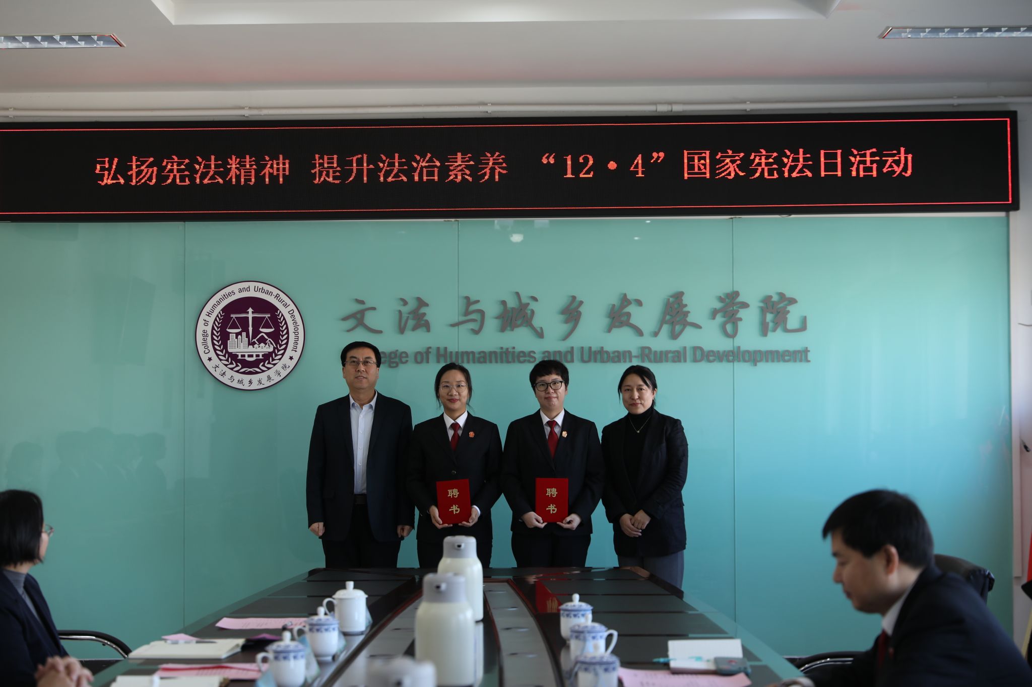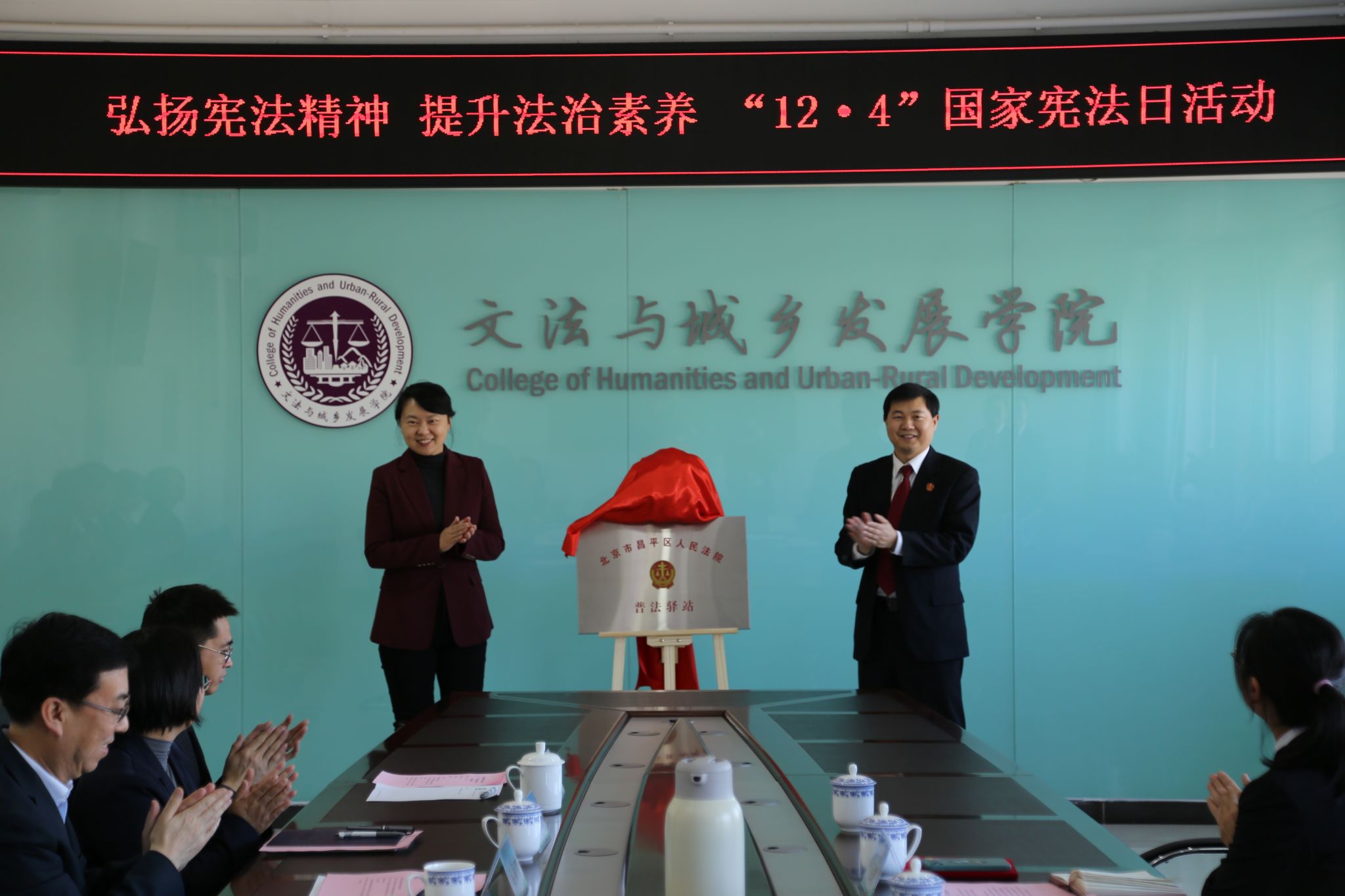 11月29日,學(xué)校舉辦國家憲法日校院共建活動,北京市昌平區(qū)人民法院訴源治理人才孵化(培養(yǎng))基地、北京市昌平區(qū)人民法院普法驛站正式在我校掛牌成立。學(xué)校黨委常委、副院長武艷,昌平區(qū)人民法院黨組成員、副院長潘幼亭共同為基地和普法驛站揭牌。武艷為潘幼亭頒發(fā)了客座教授聘書。文發(fā)學(xué)院負(fù)責(zé)人為沙河法庭庭長邵敏、副庭長劉敏頒發(fā)了校外導(dǎo)師聘書。