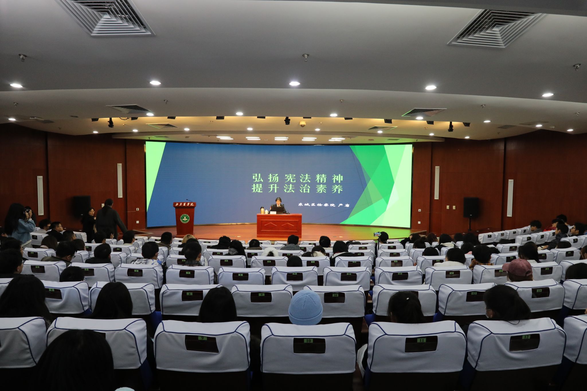 11月29日,學(xué)校還在圖書館報告廳舉辦“弘揚(yáng)憲法精神提升法治素養(yǎng)”專題講座。北京市東城區(qū)人民檢察院第三檢察部副主任嚴(yán)巖作專題報告。嚴(yán)巖圍繞憲法定義和公民權(quán)利義務(wù)向同學(xué)們講解了憲法和刑法的基礎(chǔ)知識,并通過大學(xué)生酒駕、吸毒、故意傷害等案例,提醒同學(xué)們要加強(qiáng)自身防范意識,約束自身行為。