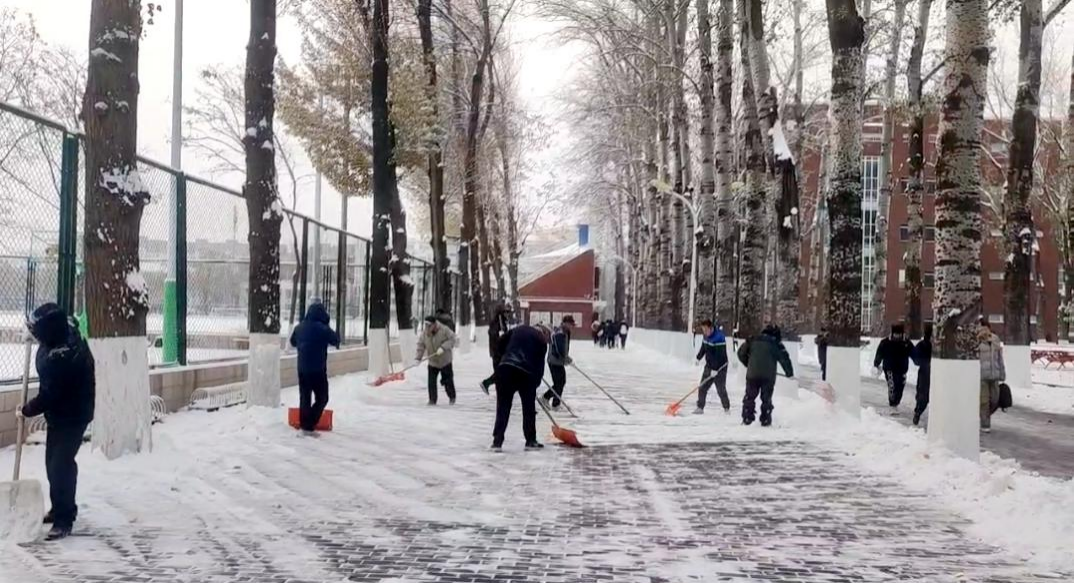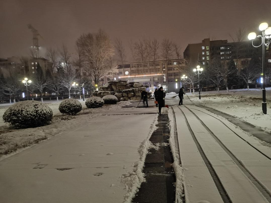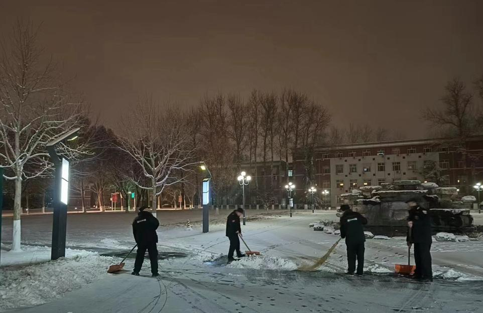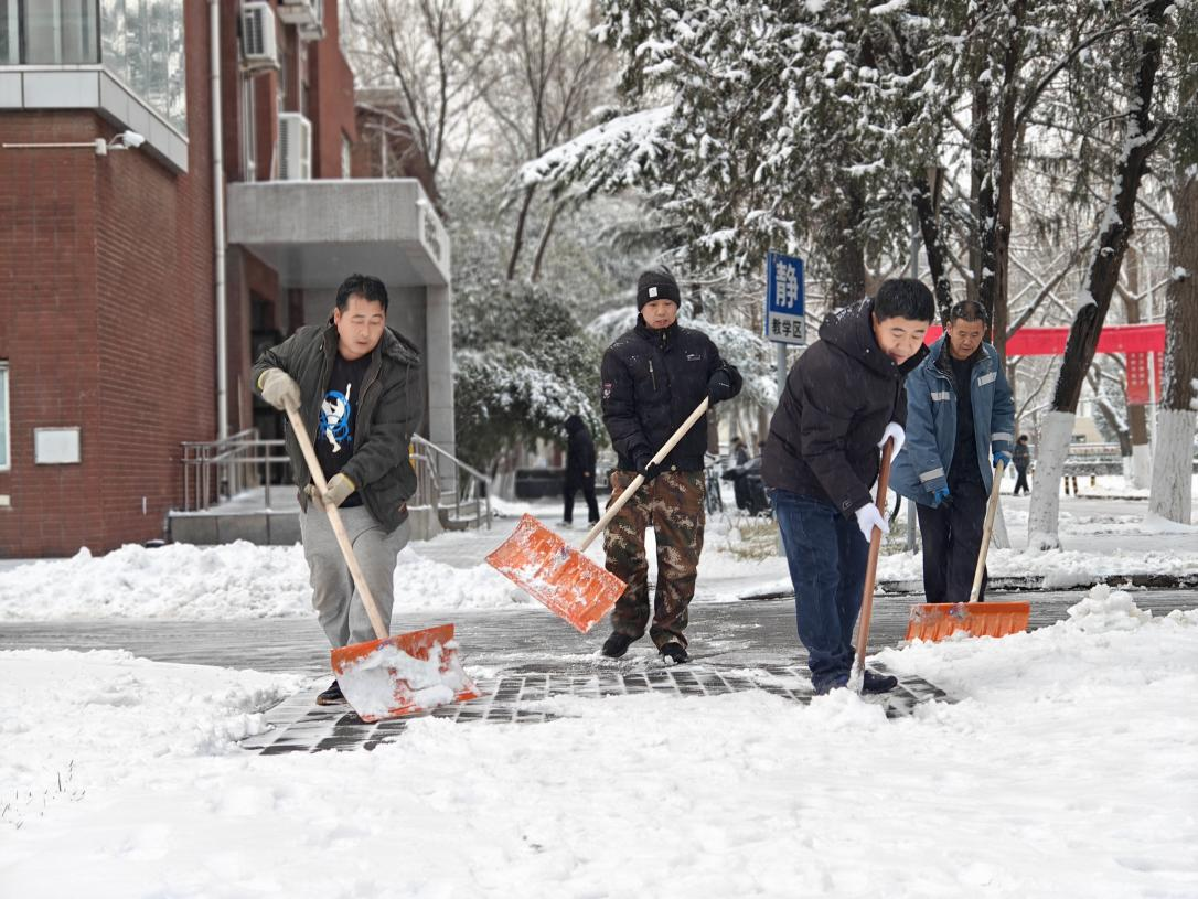 中央氣象臺發(fā)布小到中雪、道路結冰黃色預警后,后勤基建處聞雪而動,連夜制定應急預案,組建“清掃突擊隊”,分組包片、聯(lián)動工作,全力保障師生安全出行。