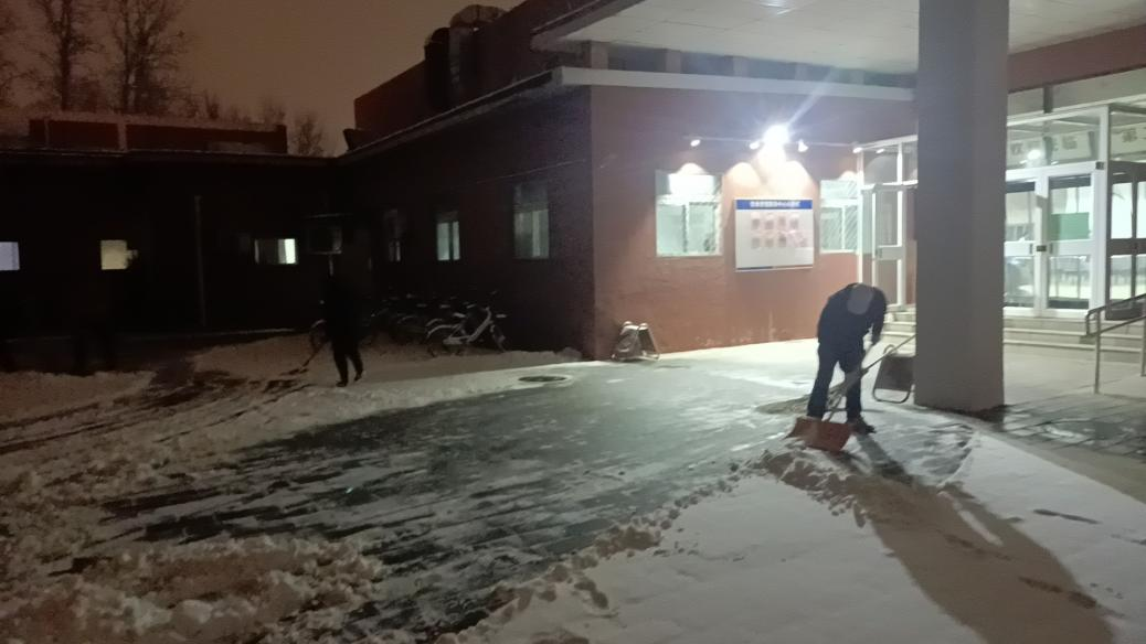 安全穩(wěn)定工作部組織學校保衛(wèi)人員緊急出動,五點多開始清掃北農(nóng)路、白楊路、家屬區(qū)、學校東區(qū)西門和東北門等處的積雪,有效保障了校園及周邊道路暢通和師生出行安全。