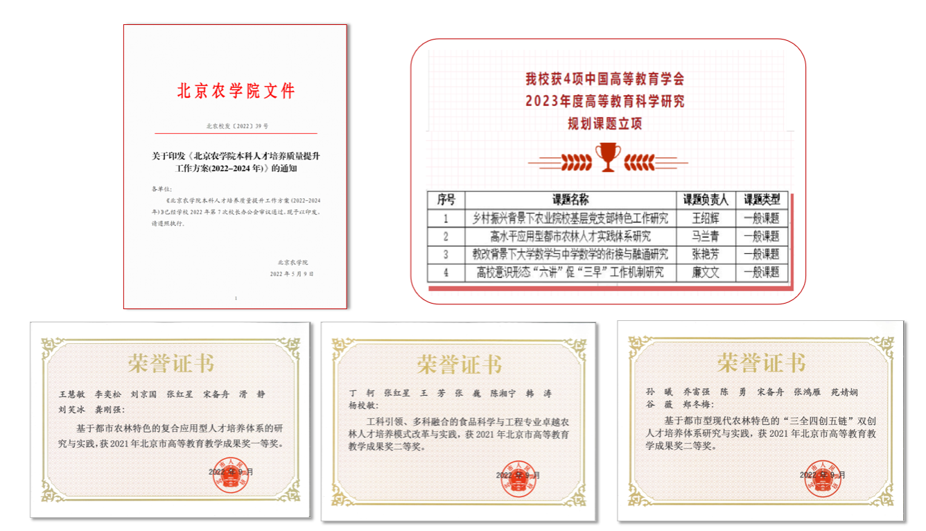學(xué)校著力增強(qiáng)本科教育教學(xué)質(zhì)效,發(fā)布本科人才培養(yǎng)質(zhì)量提升工作方案(2022-2024年),為不斷提高學(xué)校本科人才培養(yǎng)質(zhì)量指明方向。加強(qiáng)統(tǒng)籌規(guī)劃校級和市級本科教育教學(xué)改革項(xiàng)目,不斷拓寬教育教學(xué)改革項(xiàng)目申報(bào)渠道,完善項(xiàng)目申報(bào)管理制度,調(diào)整優(yōu)化教改項(xiàng)目評審專家?guī)臁H陙恚瑢W(xué)校教改項(xiàng)目申報(bào)和獲批數(shù)量實(shí)現(xiàn)雙提升,獲批國家級高等教育規(guī)劃課題5項(xiàng)、北京高等教育本科教學(xué)改革創(chuàng)新項(xiàng)目等省部級教改項(xiàng)目51項(xiàng),首次獲批北京市教育教學(xué)改革重大項(xiàng)目,“基于都市農(nóng)林特色的復(fù)合應(yīng)用型人才培養(yǎng)體系的研究與實(shí)踐”等3項(xiàng)成果榮獲2021年北京市高等教育教學(xué)成果獎。