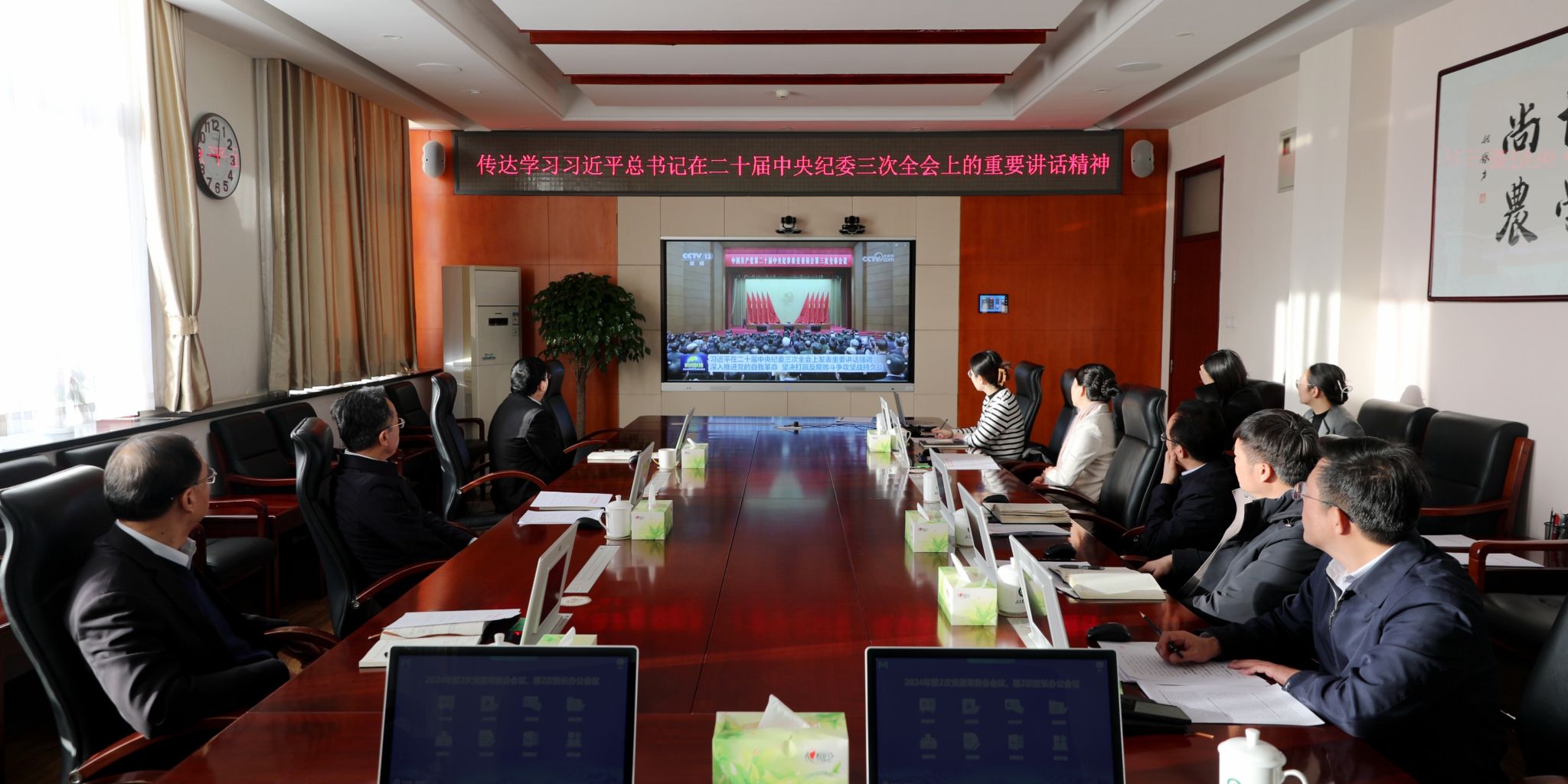 會議強調,要深刻學習貫徹習近平總書記的重要講話精神,深入把握習近平總書記關于黨的自我革命重要思想的精髓要義、實踐要求,把思想和行動統一到習近平總書記重要講話精神和此次全會重要部署上來,全面推動從嚴治黨主體責任在我校各級黨組織中層層壓實、層層落實。要突出問題導向、目標導向和效果導向,以發現問題為導向、以解決問題為抓手、以師生滿意為目標,打通全面從嚴治黨的“最后一公里”,持續營造風清氣正、擔當作為、干事創業的良好氛圍,切實將高質量黨建引領高質量發展落到實處、落出實效。要不斷深化紀檢監察體制改革,將正風肅紀反腐與依法治校、優化治理、保障高質量發展有效貫通;要努力推動政治監督具體化、精準化、常態化,督促學校各級黨組織、廣大黨員干部嚴明政治紀律和政治規矩,主動擔當作為、靠前作為;要大力加強校園廉潔文化建設,樹正氣樹榜樣樹典型,引導干部師生遵紀守法、廉潔自律、勤儉務實,筑牢思想道德防線和規矩紀律底線,共同打造風清氣正的政治生態和育人環境,為全面建設國內一流國際知名都市農林特色高水平應用型大學提供堅強保證。