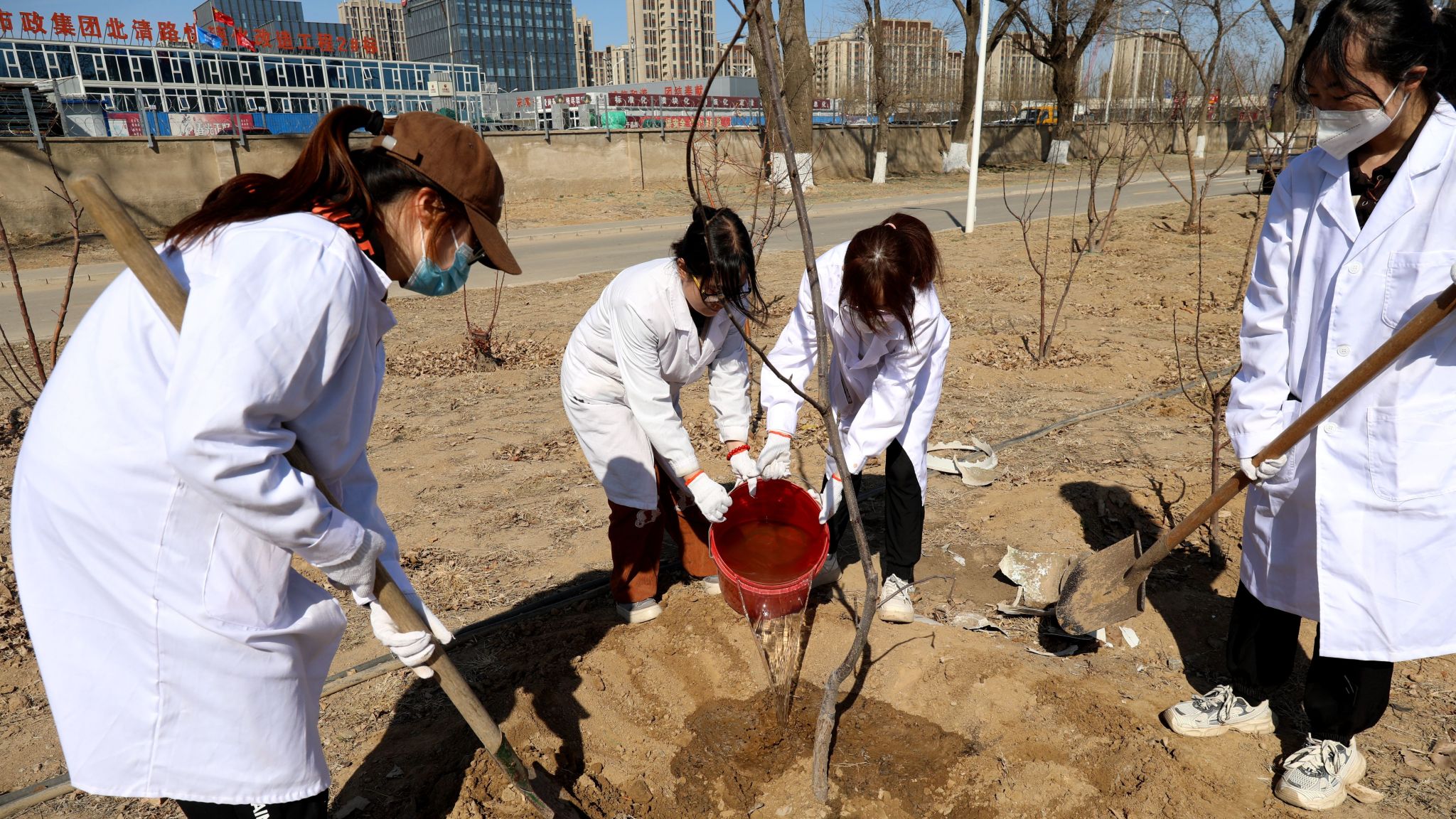 講授完專業知識,張卿率先拿起鐵鍬,向同學們示范如何種果樹。緊接著,研究生黨員和本科生組隊,開始了植樹活動。他們揮動鐵鍬,扶樹培土,提水澆灌,分工有序、配合默契,呈現出一派熱火朝天的勞動景象。經過一個多小時的勞作,100多棵果樹全部完成了種植。“后續果樹種植管理也由研究生和本科生共同完成,充分發揮研究生樣板黨支部的示范作用和朋輩引領力量,一起種好這片果樹林。”