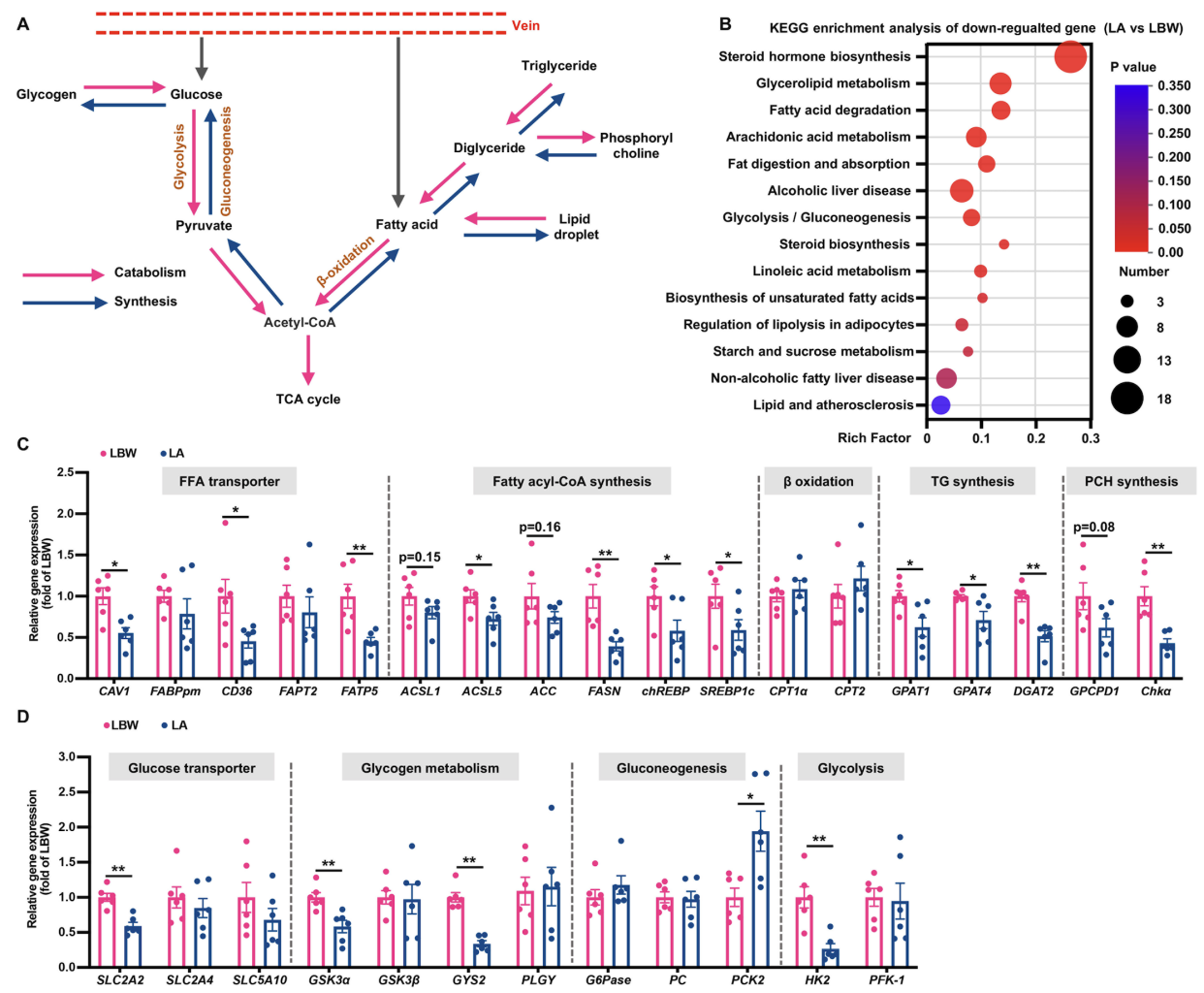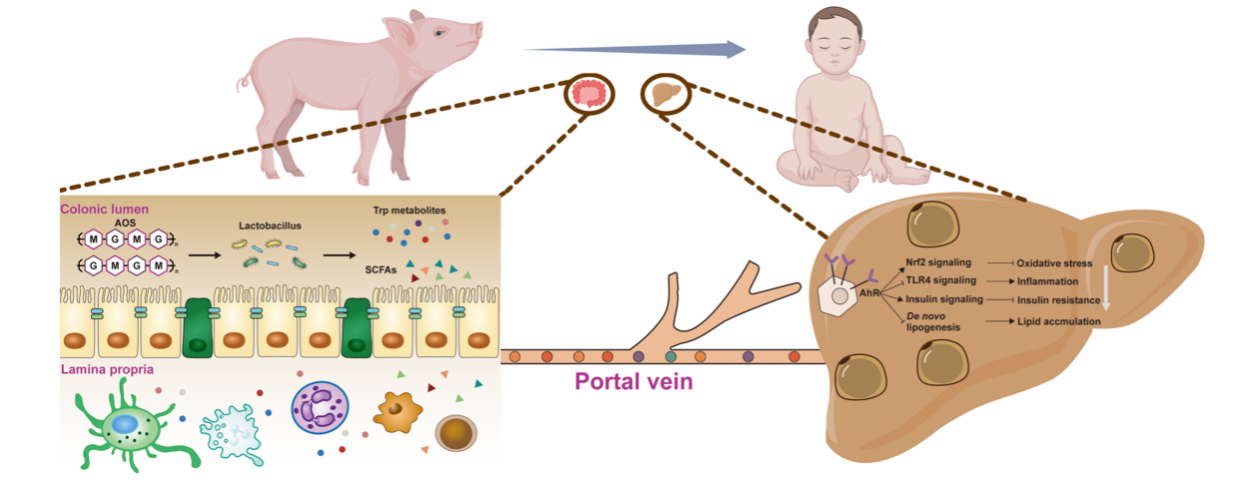 哺乳動物妊娠期間的胚胎及器官生長發育受損,造成胎兒宮內發育遲緩(Intrauterine growth retardation, IUGR)。IUGR導致胎兒出生重量低(Lowbirth weight, LBW)、免疫組織發育不良、消化道組織形態改變、消化酶活性顯著降低,以及肝臟糖脂代謝異常,后期往往表現出生長遲緩與發育不良,是威脅哺乳動物健康的重要因素。AOS是從海洋藻類中提取出的一種功能性寡糖,具有多種生物學功能,如調節免疫、抗氧化、抑菌和優化腸道菌群等,目前已被農業農村部批準為國家I類新飼料添加劑產品。研究以LBW仔豬為模型,飼喂AOS改善LBW仔豬結腸黏膜免疫應答(圖2),抑制肝臟脂質合成和改善葡萄糖代謝(圖3)。多組學聯合分析揭示AOS通過提高腸道乳酸桿菌豐度,促進色氨酸代謝、短鏈脂肪酸生成以及芳香烴受體激活,發揮調節腸黏膜免疫和肝臟糖脂代謝的作用。