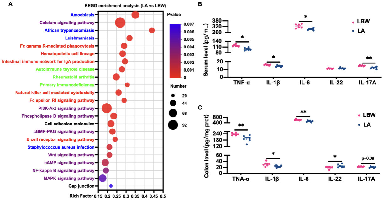 本研究通過微生物組、代謝組與轉錄組等分析技術,揭示了天然功能成分褐藻寡糖(Alginate oligosaccharides, AOS)通過調節腸道微生物及其代謝產物,改善低出生重的幼齡哺乳動物腸道黏膜免疫紊亂與肝臟糖脂代謝異常的作用機制,為海洋藻類多糖調控畜禽免疫與代謝穩態提供科學依據(圖1)。