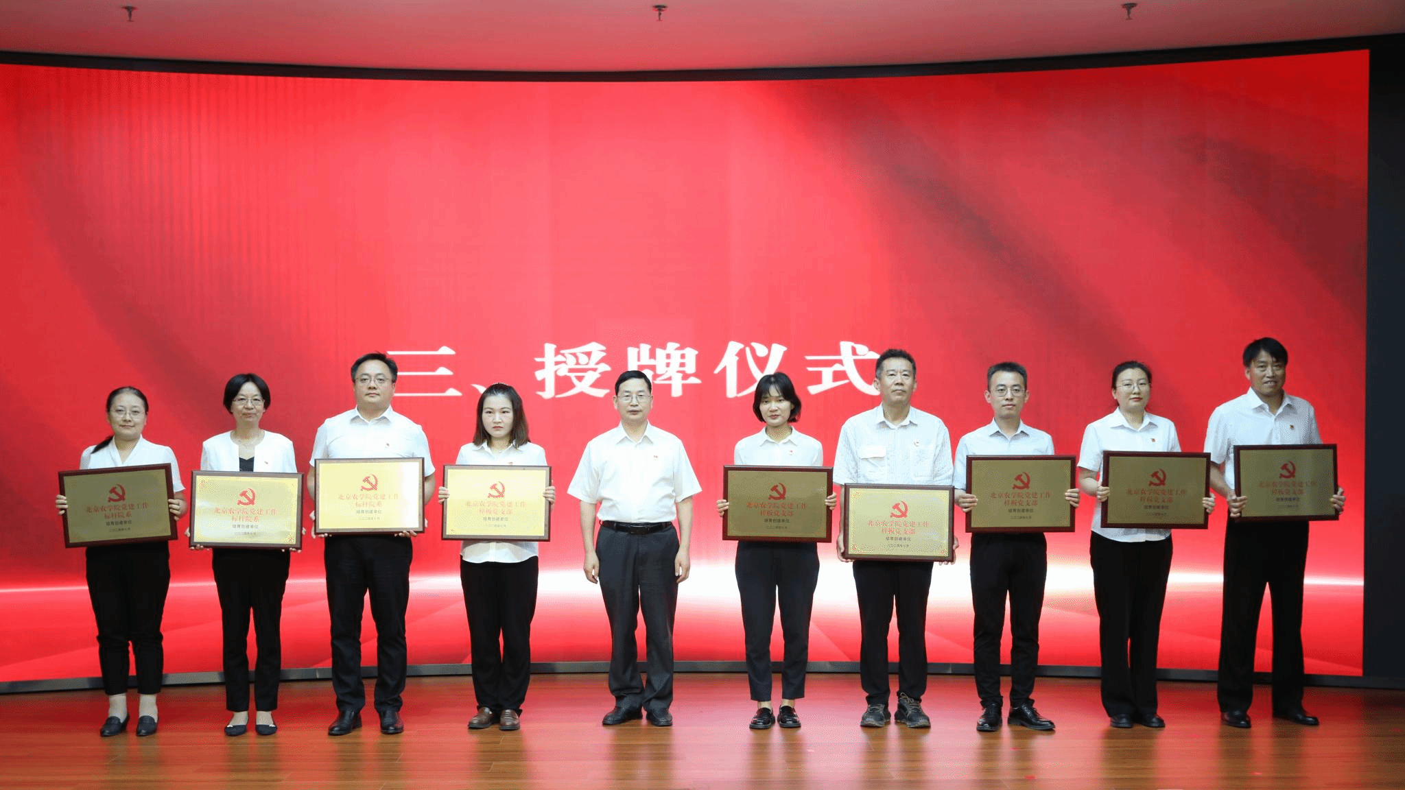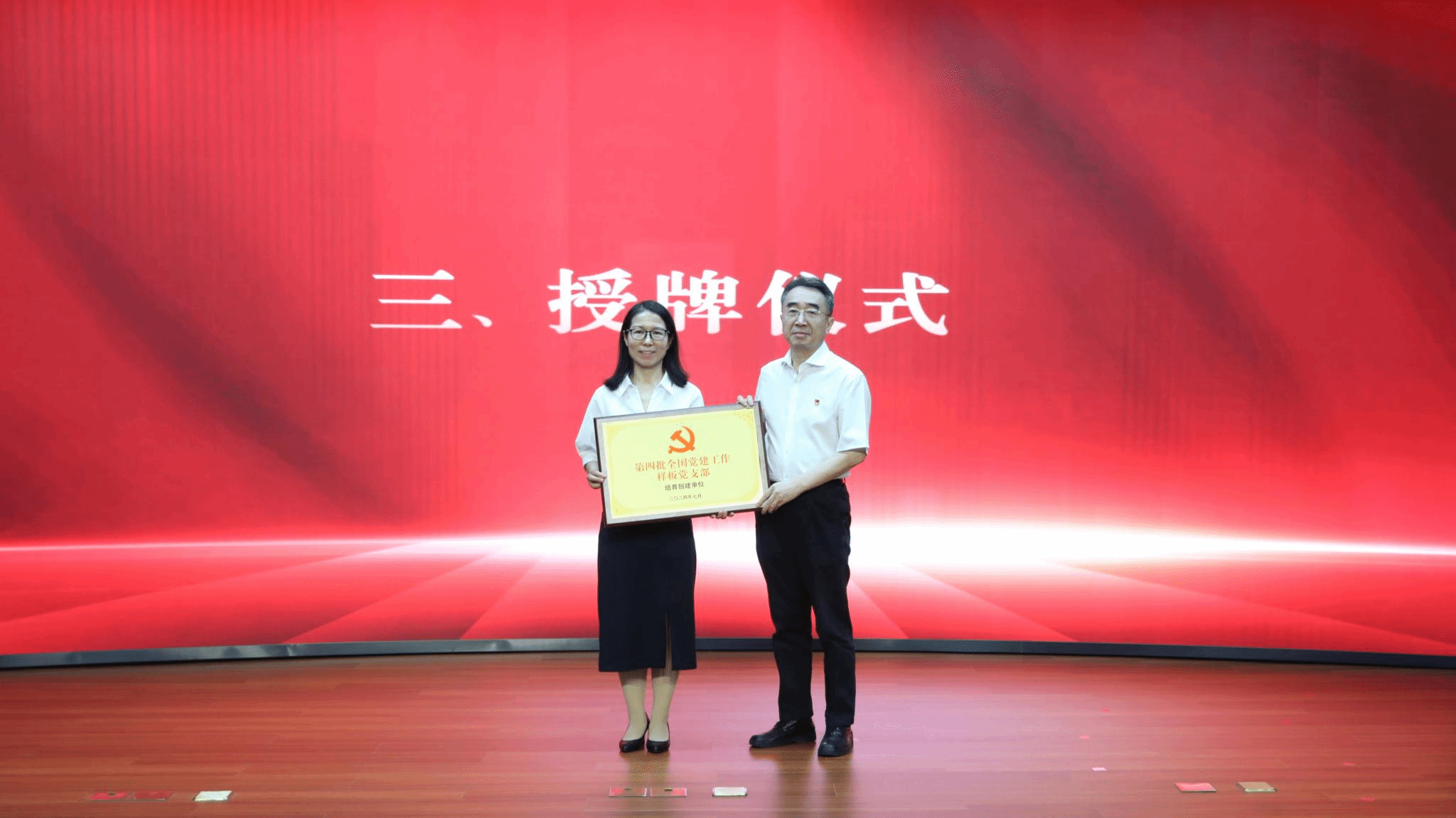 仲叢生宣讀學校入選第四批全國黨建工作樣板支部名單及學校培育創建的黨建工作標桿院系、樣板支部名單。趙鋒為第四批全國黨建工作樣板支部授牌,黨委副書記、院長段留生為學校培育創建的3個黨建工作標桿院系、6個樣板支部授牌。