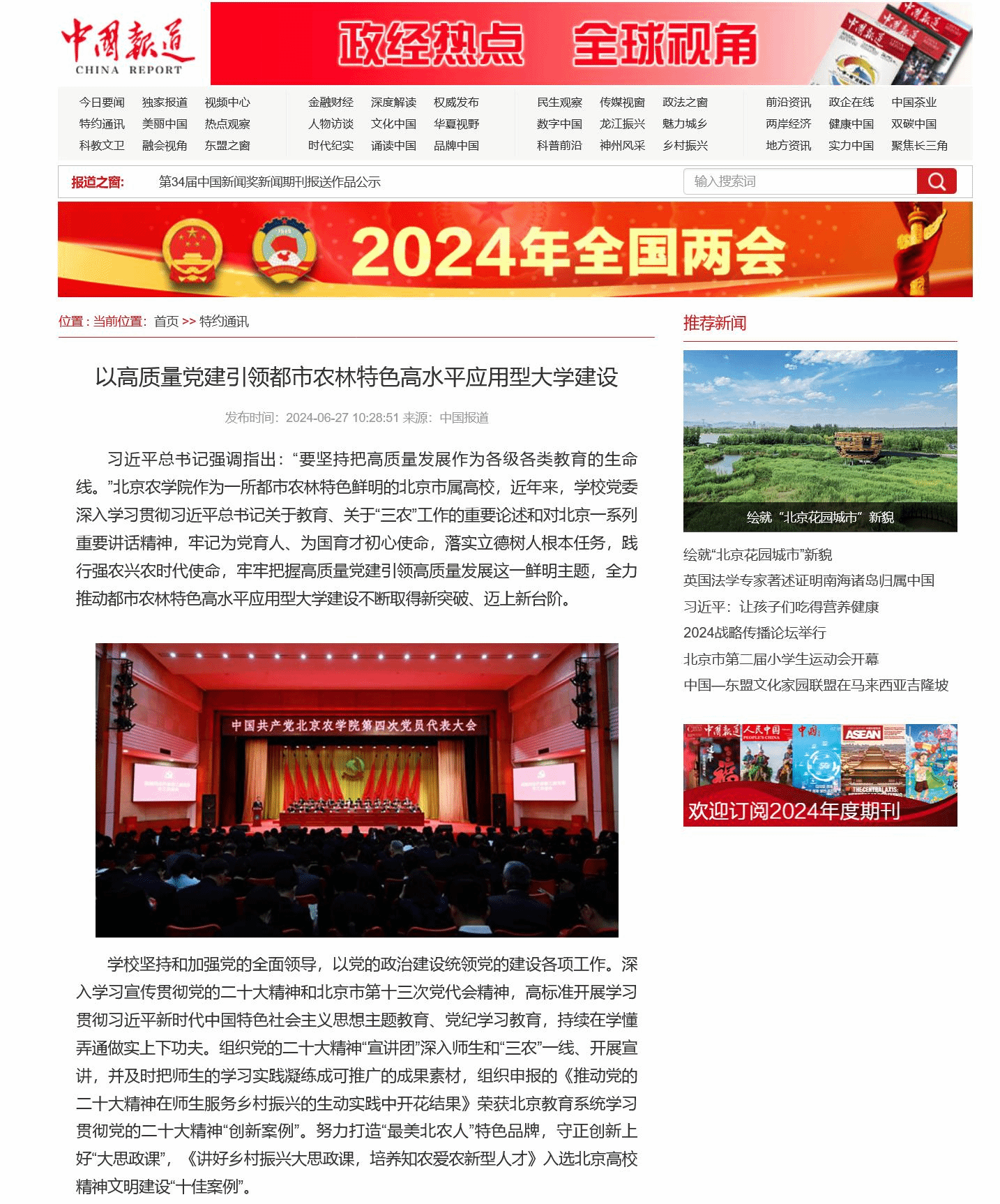 在中國共產黨成立103周年來臨之際,《中國報道》對我校以高質量黨建引領都市農林特色高水平應用型大學建設的做法和成效進行專題報道。