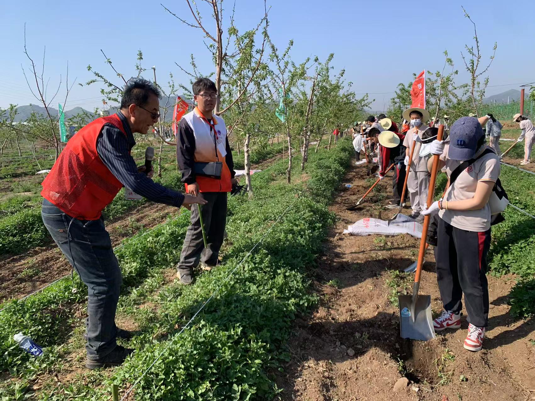 五一前夕,文法與城鄉發展學院高程達老師、生物與資源環境學院劉悅萍老師帶領寅洞村科技小院師生在平谷區劉家店鎮為北京師范大學附屬中學初二年級900余名師生開展耕讀研學活動,為同學們提供了一次沉浸式的農業知識學習體驗。劉悅萍在生態橋園區為學生們講解“桃園廢棄物資源化利用”知識,高程達在丫吉農場精心指導學生們學習了“桃園整地作畦”的專業技能。