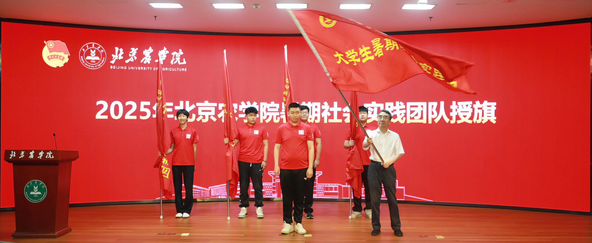 趙鋒為師生實踐團隊代表授旗。今年暑期,學校將組織521支團隊、3000余名師生奔赴祖國各地鄉村振興一線開展支農扶農社會實踐。