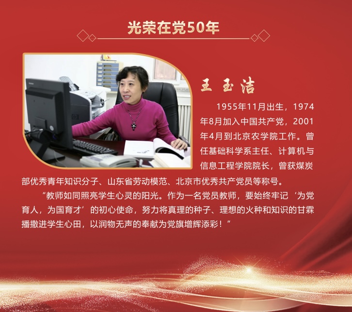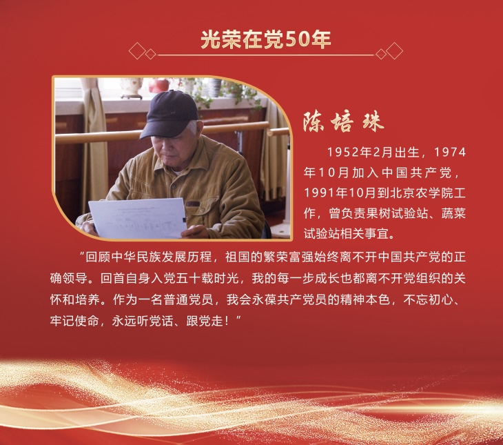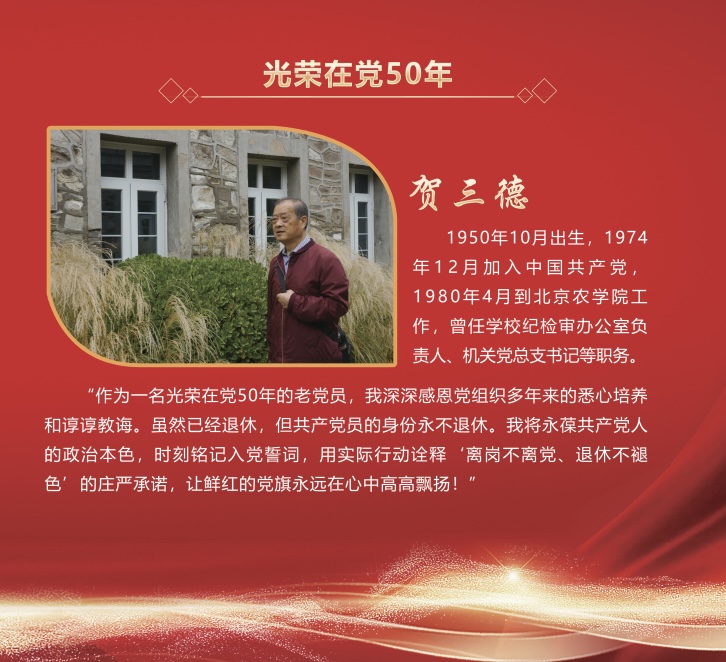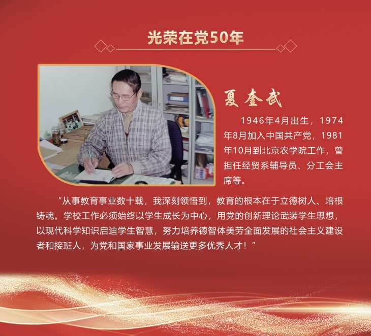 五十載初心如磐,半世紀信仰彌堅。根據中央和北京市委有關文件精神,學校向黨齡達到50周年、一貫表現良好的黨員頒發“光榮在黨50年”紀念章。夏奎武、賀三德、陳培珠、王玉潔4名黨員獲此榮譽。他們始終堅定理想信念、堅守初心使命,用奮斗和耕耘踐行入黨誓詞,用心血和智慧為學校改革發展貢獻力量,用付出和奉獻詮釋對黨的忠誠。