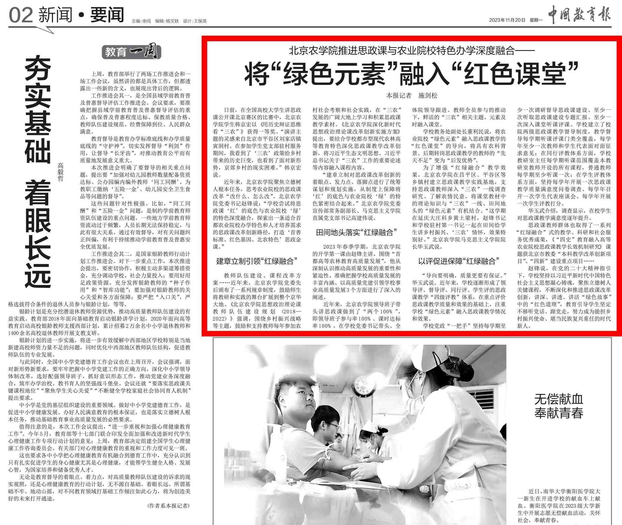 完善思政課“四級評價體系”,學(xué)生對思政課教學(xué)滿意度達(dá)98.47%。持續(xù)推動思政課“紅色基因”與農(nóng)業(yè)院?!熬G色元素”深度融合,相關(guān)課例獲北京市委教育工委“永遠(yuǎn)跟黨走”課例征集展示活動一等獎,相關(guān)成果獲評“北京高校黨建和思想政治工作培育項(xiàng)目”。