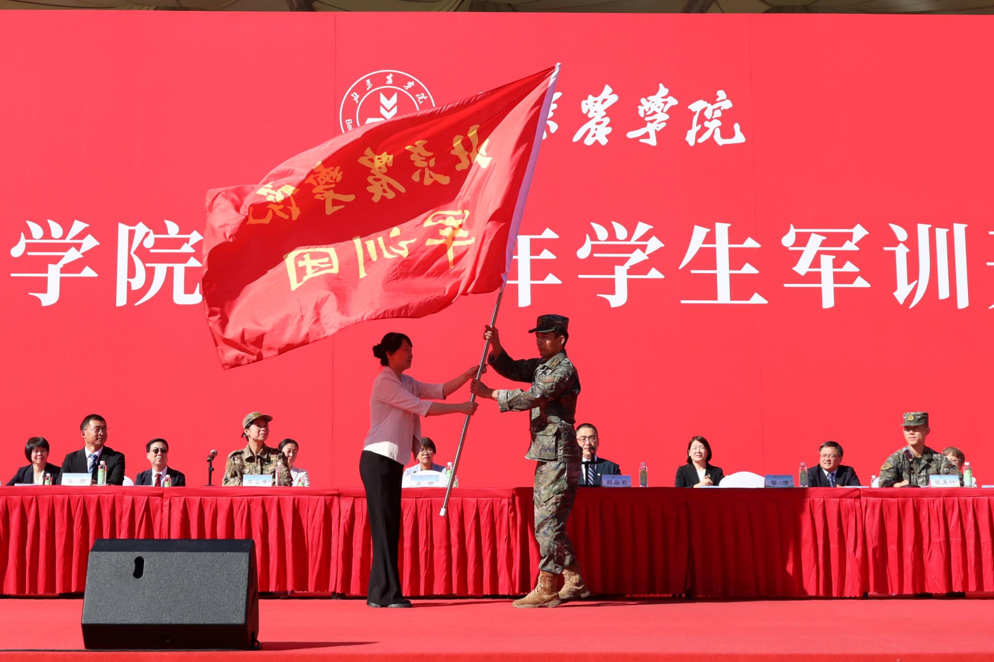 武艷向軍訓(xùn)團(tuán)授團(tuán)旗。
