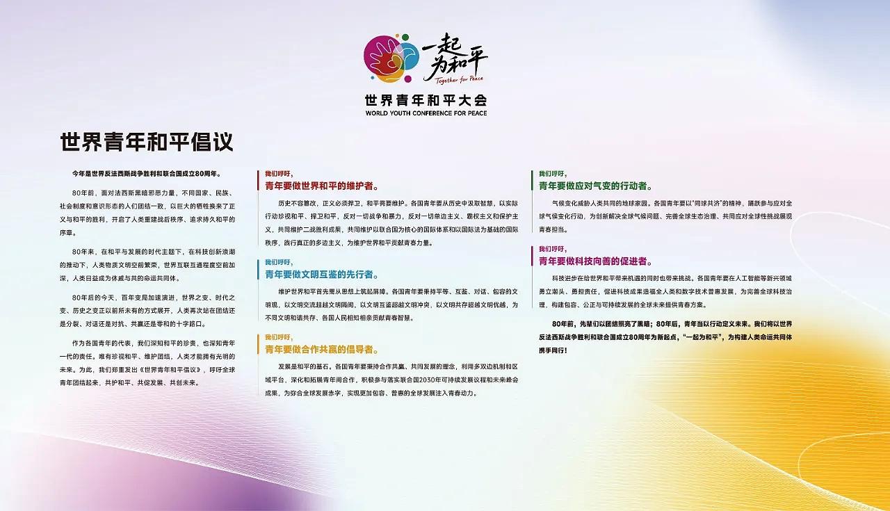 大會發布《世界青年和平倡議》,呼吁全球青年團結起來,共護和平、共促發展、共創未來,呼吁青年要做世界和平的維護者、文明互鑒的先行者、合作共贏的倡導者、應對氣變的行動者、科技向善的促進者。