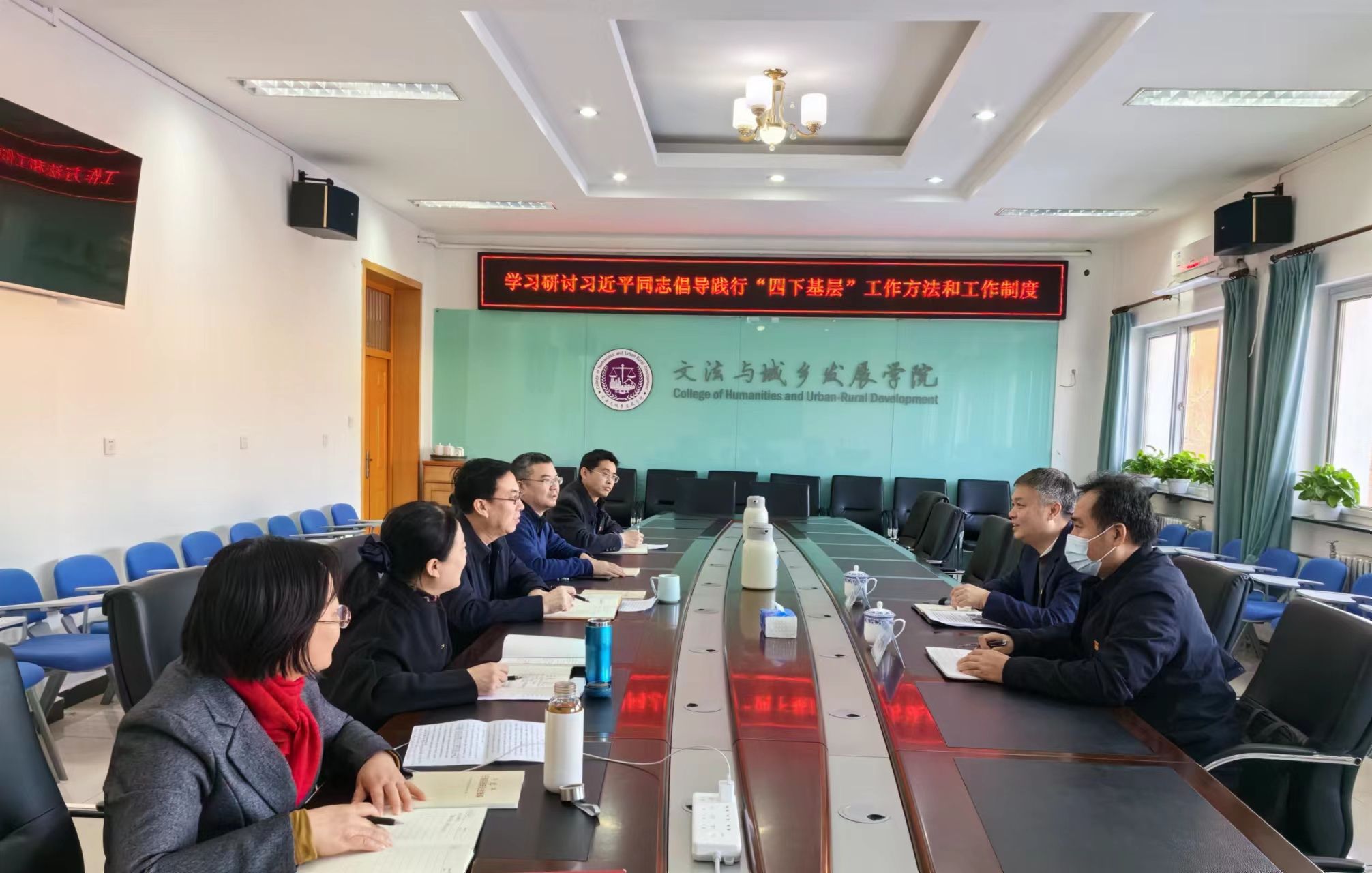 2023年12月22日上午,文法與城鄉發展學院黨委在文發樓322室召開理論學習中心組會議,學習研討習近平同志倡導踐行“四下基層”工作方法和工作制度。全體黨委理論學習中心組成員進行交流發言,圍繞學習貫徹“四下基層”工作方法和工作制度、落實新時代“楓橋經驗”,結合學習《習近平基層治理論述摘編》談體會、談收獲。學校黨委常委、副校長張勁柏,國有資產管理處處長宋文東到會指導,會議由學院黨委書記趙和文主持。