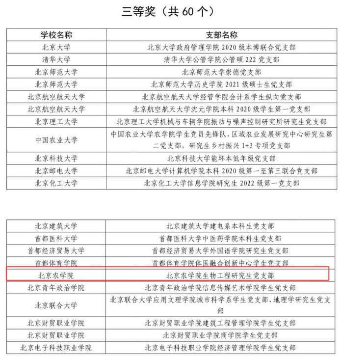 近日,2023年北京高校紅色“1+1”示范活動(dòng)評(píng)選結(jié)果公布。我院生物工程研究生黨支部在全市1615個(gè)學(xué)生黨支部中脫穎而出,榮獲三等獎(jiǎng)。