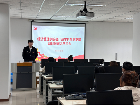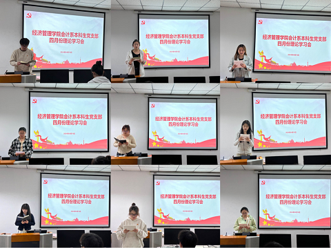 經濟管理學院會計系本科生黨支部召開四月份理論學習會,重點學習《中國共產黨紀律處分條例》以及“學習紀律強化月”的相關要求,引領帶動支部黨員、積極分子學黨紀、律自身、見行動、促發展,會議由支部書記吳曈主持。