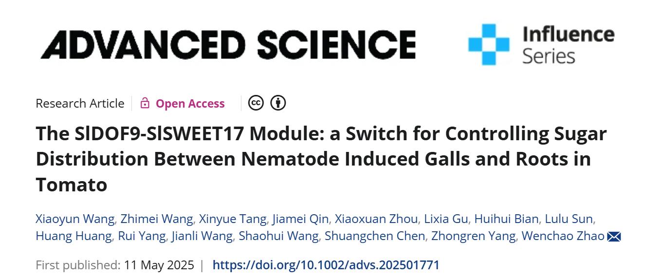 近日,我校王紹輝、趙文超教授課題組在國際知名期刊Advanced Science (IF5=16.3)上發(fā)表題為The SlDOF9-SlSWEET17 module: A switch for controlling sugar distribution between nematode induced galls and roots in tomato的研究論文,揭示了糖轉(zhuǎn)運蛋白SWEET17作為植物根系與根結(jié)之間糖分配的負調(diào)節(jié)因子影響番茄對根結(jié)線蟲敏感性的機制,為根結(jié)線蟲的防治工作提供新的思路。它也是目前鑒定出的首例負調(diào)控其他SWEET蛋白糖運轉(zhuǎn)功能的SWEET。