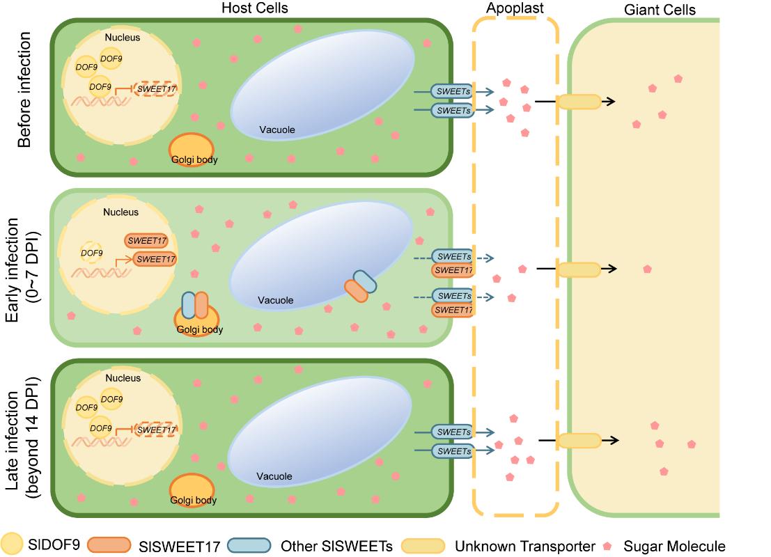 研究人員提出了SlDOF9-SlSWEET17模塊作為“分子開關(guān)”在根結(jié)線蟲侵染全過程中的動態(tài)調(diào)控規(guī)律,分為三個關(guān)鍵階段:正常條件下:SlDOF9與SlSWEET17維持基礎(chǔ)表達水平。此時,SlDOF9通過結(jié)合SlSWEET17啟動子并抑制其表達,允許其他高活性糖轉(zhuǎn)運蛋白(如SlSWEET1c、SlSWEET1e 等)正常向根部質(zhì)外體運輸糖分,保障植物自身生長所需的營養(yǎng)分配平衡,同時避免過度防御消耗自身能量;侵染早期(0-7天):當(dāng)線蟲侵入根系并開始誘導(dǎo)根結(jié)形成時,SlDOF9表達量迅速下調(diào),解除對SlSWEET17的轉(zhuǎn)錄抑制。此時SlSWEET17蛋白通過與其他高活性SWEET蛋白結(jié)合,形成異源二聚體,降低后者的糖轉(zhuǎn)運能力。這一 “蛋白互作剎車”機制可有效減少糖分向根結(jié)富集,通過 “饑餓戰(zhàn)術(shù)”抑制線蟲幼蟲發(fā)育,為植物啟動免疫反應(yīng)爭取時間;侵染后期(14天以后):隨著根結(jié)線蟲進入寄生穩(wěn)態(tài)階段,此時SlDOF9的表達量回升,重新抑制SlSWEET17轉(zhuǎn)錄,釋放被封鎖的高活性SWEET蛋白。盡管這為線蟲提供了部分糖分營養(yǎng),但避免了根系長期糖剝奪導(dǎo)致的發(fā)育障礙,體現(xiàn)了植物在抵御病原與維持自身生存之間的“策略性妥協(xié)”。