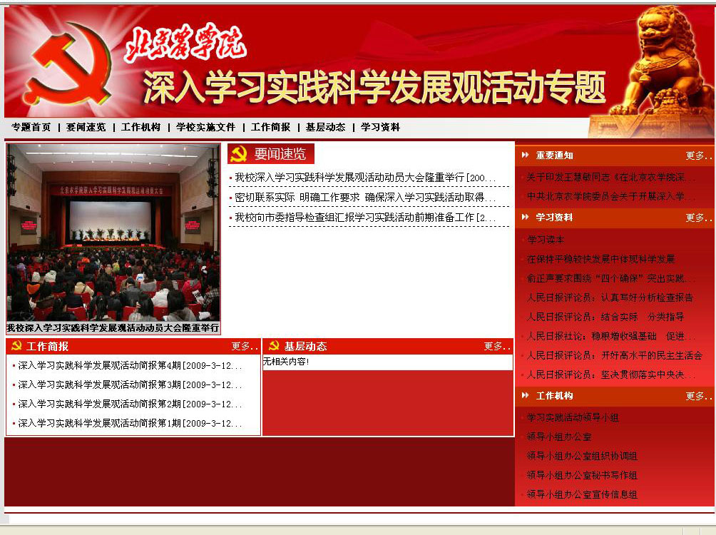 3月12日,我校深入學(xué)習(xí)實踐科學(xué)發(fā)展觀活動全面展開。由我校深入學(xué)習(xí)實踐科學(xué)發(fā)展觀活動領(lǐng)導(dǎo)小組辦公室主辦、新聞網(wǎng)承辦的北京農(nóng)學(xué)院深入學(xué)習(xí)實踐科學(xué)發(fā)展觀活動專題網(wǎng)站也正式開通。