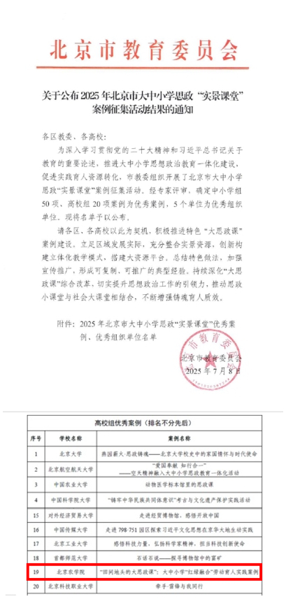 近日,北京市教育委員會、北京市高等教育學會先后公布了2025年北京市大中小學思政“實景課堂”案例征集活動評選結果、2025年教育教學改革示范案例評選活動評選結果,我校報送的《“田間地頭的大思政課”:大中小學“紅綠融合”勞動育人實踐案例》和《“紅+綠”的實證課堂:農林院校<習近平新時代中國特色社會主義思想概論>教學改革創新》案例在眾多高校中脫穎而出,分別榮獲北京市大中小學思政“實景課堂”優秀案例和教育教學改革示范案例。