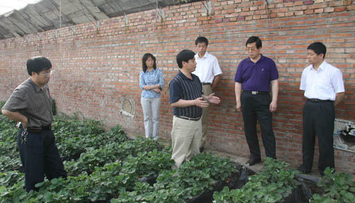 5月18日下午,校長王有年教授、校黨委副書記高喜軍在昌平區(qū)科委主任于泓等的陪同下來到我校新農(nóng)村建設(shè)基地興壽鎮(zhèn)麥莊進(jìn)行項(xiàng)目考察調(diào)研。在由我校植物科技學(xué)院承擔(dān)的無土栽培設(shè)施草莓克服重茬技術(shù)試驗(yàn)示范的溫室大棚里,項(xiàng)目技術(shù)負(fù)責(zé)人董清華副教授匯報(bào)了兩年來項(xiàng)目的試驗(yàn)示范情況,認(rèn)為初步探索出了克服設(shè)施草莓重茬的簡(jiǎn)易無土栽培體系—SSS體系。該項(xiàng)目由我校“1+1+X”項(xiàng)目和昌平區(qū)科委共同資助