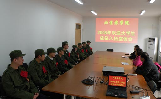 之間,有上百名學生,前來學校武裝部咨詢,共有32名在校生踴躍報名參軍,其中:21名男生報名,11名女生報名。在昌平區征兵辦公室的認真組織下,經過多次嚴格的體檢、復查、政審,目前我校共有9名同學接到了入伍通知書,其中8名男生,1名女生。這9名同學分別是城鄉發展學院賈雨林、蘇帥、聶凡,園林系的李喬、經濟管理系的趙京飛、崔思野,生物系的李雅山、植科系的李響,政法系的于寒。其中去武警部隊3人,去陸軍部隊4人,去空軍部隊2人。所去省份有河北、湖北、河南等地。