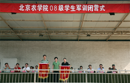 7月10日上午8:30,我校2008級學生軍訓閉營儀式在懷柔區群英昊軍訓基地舉行,北京市學生軍訓辦公室主任教授級大校張培松、黨委書記王慧敏、黨委副書記高東、紀委書記朱生利、黨政辦公室、宣傳部、教務處、學生處以及各系領導出席閉營儀式,閉營儀式由學生處副處長張國柱主持。