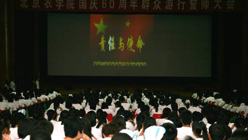 8月13日上午,我校參訓師生在禮堂觀看《責任與使命——北京農學院國慶60周年群眾游行集訓剪影》短片。短片受到了參訓師生的歡迎。