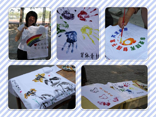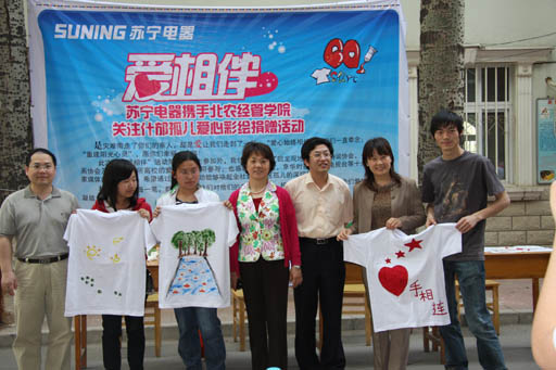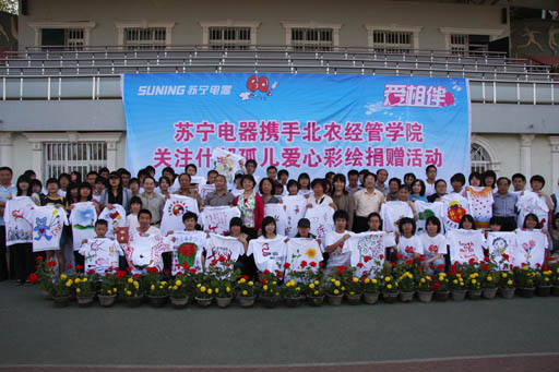 5月3日下午,主題為“愛心始終相伴,重建陽光心靈——蘇寧電器攜手北京農學院關注什邡孤兒愛心彩繪捐贈活動”在學校操場邊的林蔭大道舉行。此次活動旨在紀念去年5.12汶川大地震。100余名參與者按照活動主題及自我創意設計圖樣,將彩繪繪到白色T恤衫上,共有十件作品獲獎。這些獲獎作品將作為模板批量印制在T恤上捐給災區兒童,以表達對災區的一片關愛與祝福。黨委副書記高東出席活動開幕式。