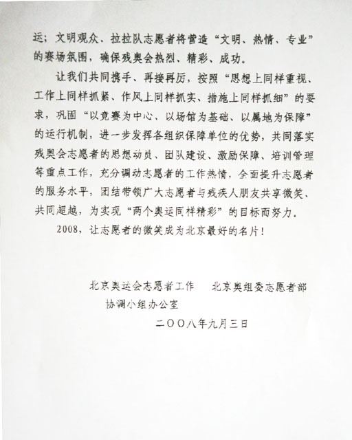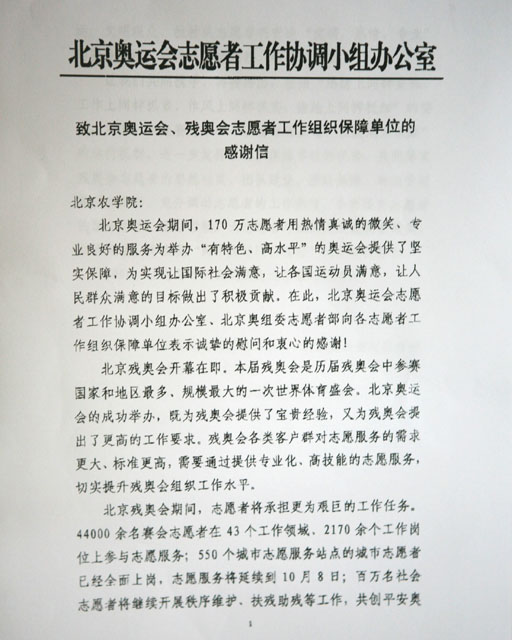 舉世矚目的北京奧運會、殘奧會已圓滿結束,奧運志愿者的真誠微笑、專業的服務也銘記于我們每個人心中。近日,北京奧組委發來感謝信,對我校奧運志愿者組織工作給予高度評價,對我校奧運志愿者表示衷心的感謝。感謝我校志愿者為實現讓國際社會滿意、讓各國運動員滿意、讓人民群眾滿意的目標做出積極貢獻。同時,中國少數民族體育協會也感謝我校對奧運會開幕式上的“56個民族國歌合唱團”表演的大力支持。