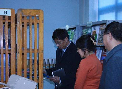 11月17日下午,黨委副書記高喜軍到圖書館考察調研。高書記詳細了解了圖書館的人員、業務工作狀況以及新館建設準備情況,走訪了各服務窗口,與各室當班人員進行了親切的交談,詢問了一些資源建設及讀者服務等工作業務問題,傾聽員工訴求,饒有興趣的觀察了讀者使用RFID自助式借還系統。考察調研過程中,高書記還對特色設施、讀者服務、新館建設以及國外圖書館印象等談了個人意見和看法。直屬黨支部書記高飛陪同高喜軍副書記考察調研,并就高書記關心的問題作了介紹和說明。