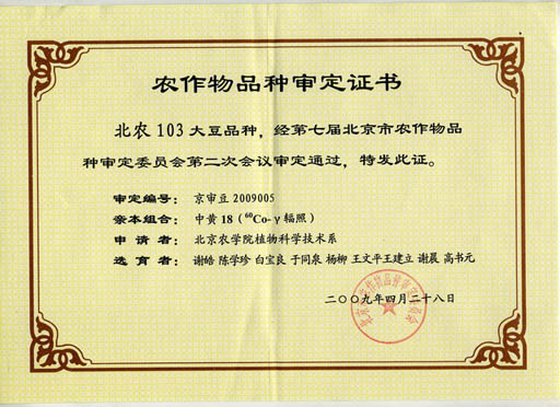 我校大豆課題組謝皓、陳學珍、白寶良、于同泉、楊柳、王文平、王建立、謝晨、高書元等科技人員培育的大豆品種“北農103”近日經北京市農作物品種審定委員會審定通過。這是繼“北農101”之后又一審定通過的具有自主知識產權的大豆新品種。