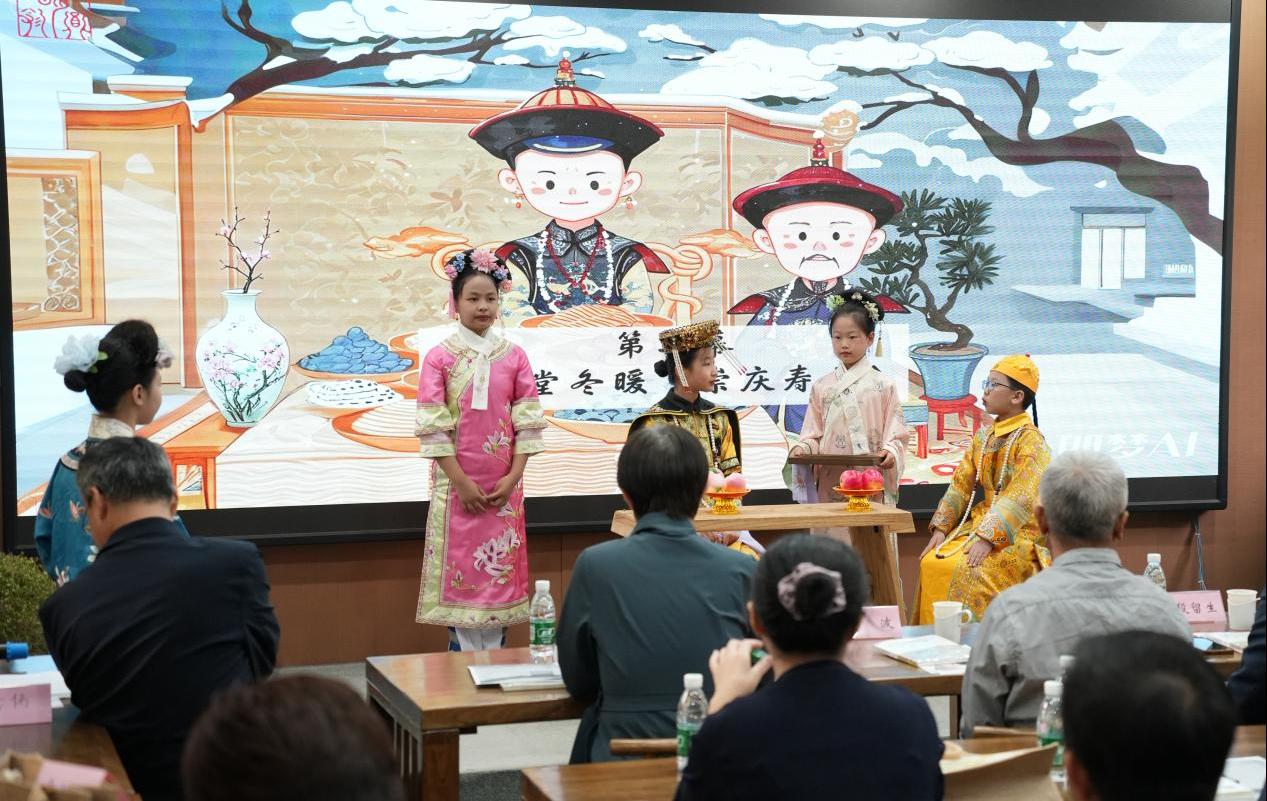 活動現(xiàn)場,北京市八一學(xué)校小學(xué)生表演的情景劇《四時天倫·圓明園里的家國溫度》成為亮點。作為《圓明園里的日常》一書的小讀者,小學(xué)生們通過戲劇的角色扮演,生動演繹了圓明園中四組真實歷史人物在四季中的家庭生活場景,包括父子交談、為母祝壽、家庭團(tuán)聚和后妃游園,喚起了在場觀眾的情感共鳴。小學(xué)生們度過了一個難忘而具有特別意義的世界讀書日。