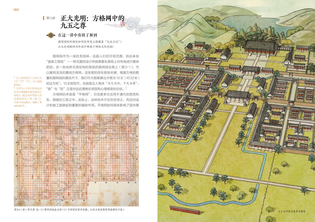 他指出,圓明園學(xué)術(shù)研究的1.0至4.0時代分別是:從依賴想象的廢墟時期(1.0時代)——基礎(chǔ)保護(hù)與整體認(rèn)知(2.0時代)——數(shù)字技術(shù)推動的直觀呈現(xiàn)(3.0時代),到當(dāng)下轉(zhuǎn)向精細(xì)化研究與文化價值深度挖掘(4.0時代)。《今日宜逛園·圓明園里的日常》通過微觀考據(jù)解析“后湖九州”景區(qū)的哲學(xué)隱喻,結(jié)合樣式雷圖檔與空間復(fù)原解讀隱藏于“正大光明”景區(qū)的“九五之比”,展現(xiàn)了新時代研究的縱深突破。