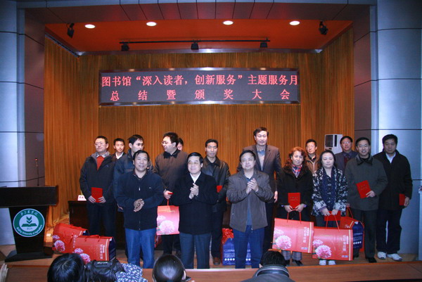會上表彰了在此次活動月中獲得系人均借書冊數(shù)、讀者借書冊數(shù)、入館人均數(shù)、教師著作捐贈和“我與改革開放三十年”征文一、二、三等獎的個人和單位,院長王有年,副院長杜曉林、鄭一淳,黨政辦主任孫亞利,學(xué)生處處長韓寶平,團委書記楊寶東分別為獲獎?wù)哳C發(fā)了獎品。