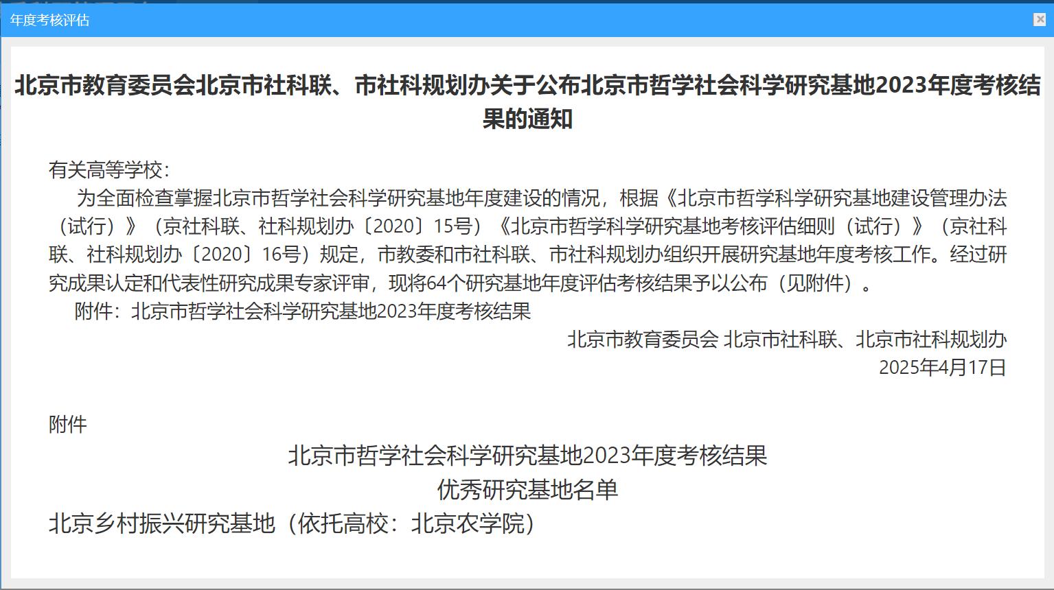 近日,市教委、市社科聯、市社科規劃辦公布了北京市哲學社會科學研究基地2023年度考核結果,經過研究成果認定和代表性研究成果專家評審,我校北京鄉村振興研究基地再次榮獲“優秀研究基地”。這是我校研究基地連續兩年獲評優秀。本年度共有64個北京市哲學社會科學研究基地參加考核,其中獲評優秀27個。