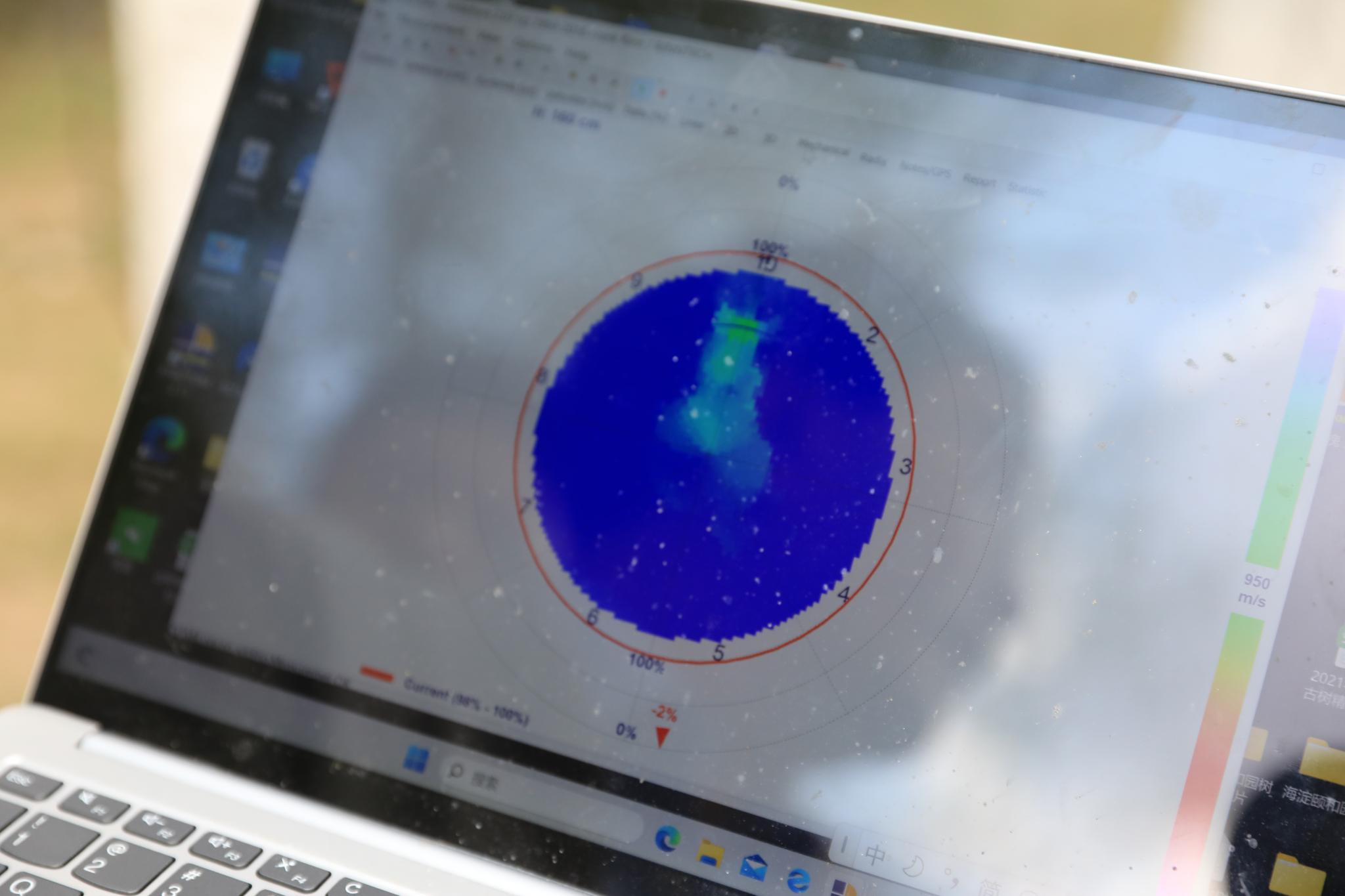 同學們排起長隊依次上前拿起“小錘”擊打探測點,盡量做到用力均衡以保證檢測數據的準確性,每繞樹敲擊一圈就跑到電腦旁查看最新的檢測圖像。
