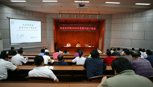 院長王有年在會上首先傳達了暑期北京高校領導干部會議精神。并從學習貫徹黨的十七大精神、教育教學和人才培養質量不斷提高、科技創新能力和科研水平穩步提升、服務首都經濟社會發展尤其是新農村建設力度不斷加大、師資隊伍建設平穩推進、校園和諧氛圍日益濃厚等六個方面回顧了學校2008年上半年的工作取得的成績。并深刻分析了工作中存在的不足。