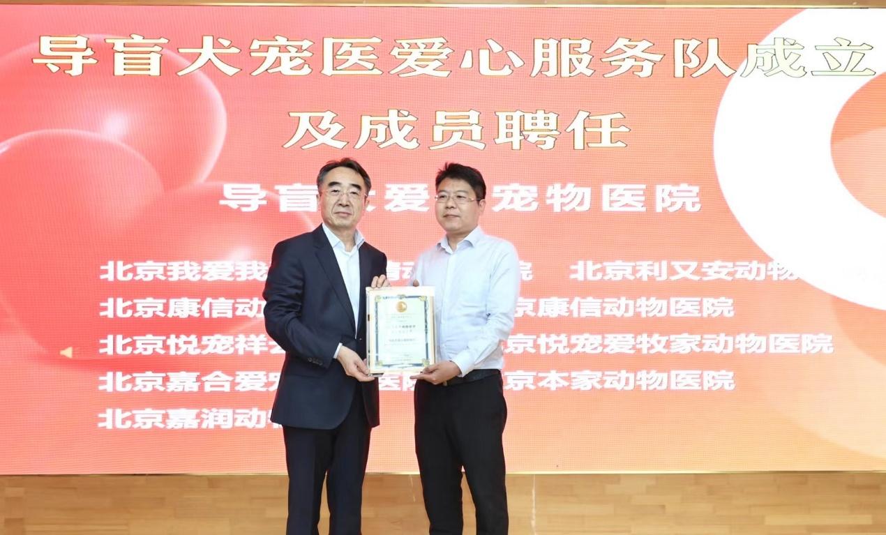 趙鋒為導盲犬愛心委員會成員、導盲犬寵醫愛心服務隊成員頒發聘書,段留生為導盲犬研究院客座教授、國際導盲犬聯盟認證導師李苑甄頒發聘書。北京寵物診療行業的14家寵物醫院的寵物醫生加入“導盲犬愛心寵醫服務隊”,學校引入國際標準訓練體系,為提升導盲犬培訓專業化、科學化、國際化水平注入強勁動能。培訓基地還聘請8名北京農學院動物科學技術學院學生為實習訓導員,他們將發揮學科專業優勢,參與基地“全周期科學訓導體系”,對導盲犬開展專業訓練和健康管理。