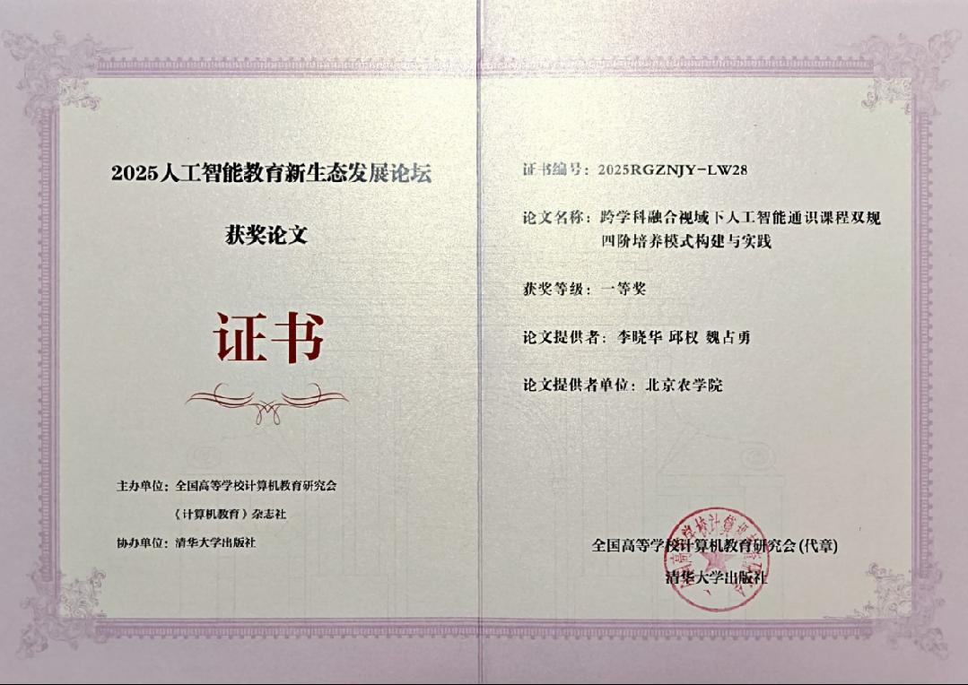 團隊將課程建設經驗凝練為論文,榮獲全國高等學校計算機教育研究會AI教育論壇一等獎并作主題分享。這既驗證了北農教學模式的創新性,也為人工智能教育提供了可參考的實踐樣本。邱權老師兩度受邀作市級專題報告,分享“AI教育北農方案” 。