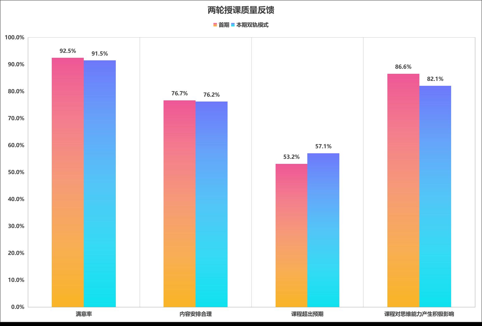 團隊的拼搏推動課程高質量落地,兩學期覆蓋37個專業、1700多名學生。學生滿意度連續兩輪都超過了90%,近八成的學生認為內容安排合理,超半數的學生表示課程超出預期,更有八成以上學生反饋課程顯著提升他們的思維能力。